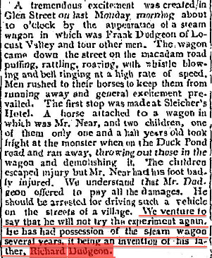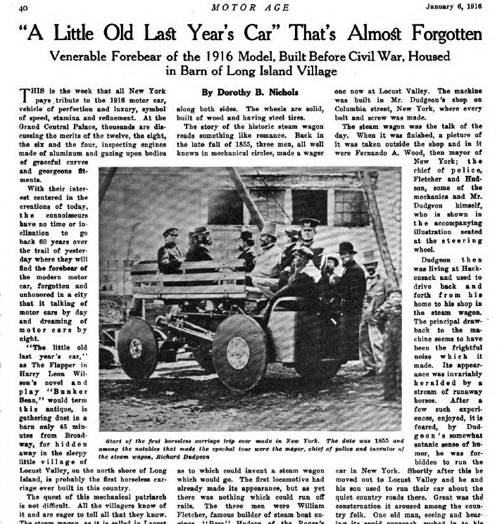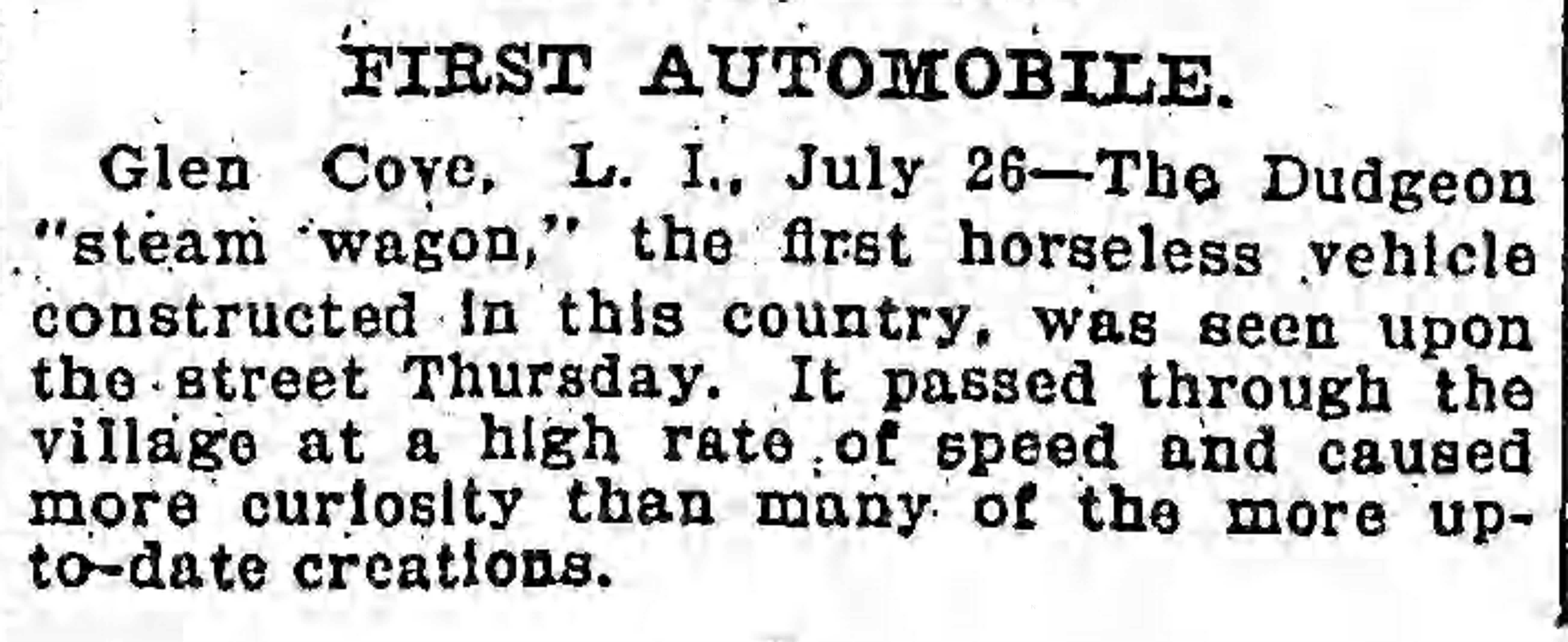 "The Dudgeon "steam wagon", the first horseless vehicle constructed in this country was seen upon the street (Glen Cove) Thursday."