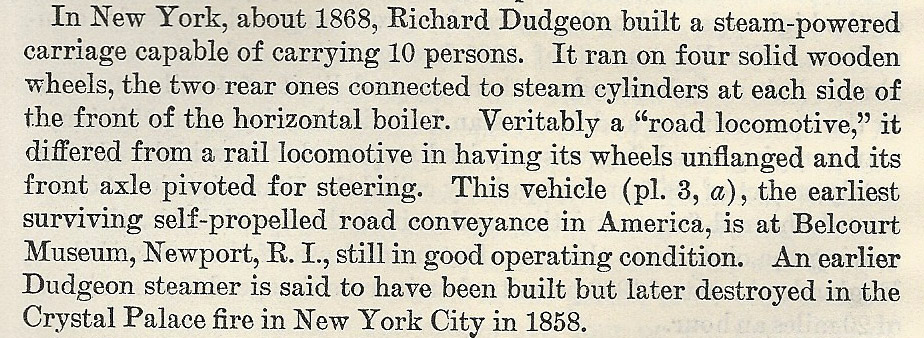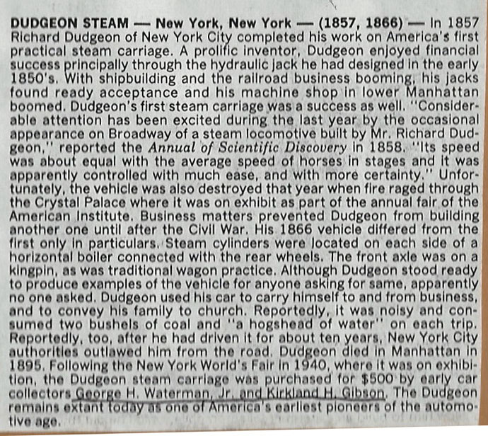 Another “Gotcha!” The 1866 Dudgeon Steam Wagon, built in Manhattan by Richard Dudgeon, which was once housed in Locust Valley and ran on Long Island in my lifetime, and which is currently (or was) on display, in running condition, in the Smithsonian’s National Museum of American History. It even ran all the way up to Albany with the then-Governor aboard. It also was up here in New England for many years. How do I know? You may be the chief guru on the Parkway but I am on the Dudgeon. I invite one and all to read all about Dudgeon and his remarkable machines (this was his SECOND!) at <http://sbiii.com/dudgeon.html>, et seq. Sam, III