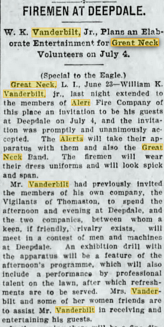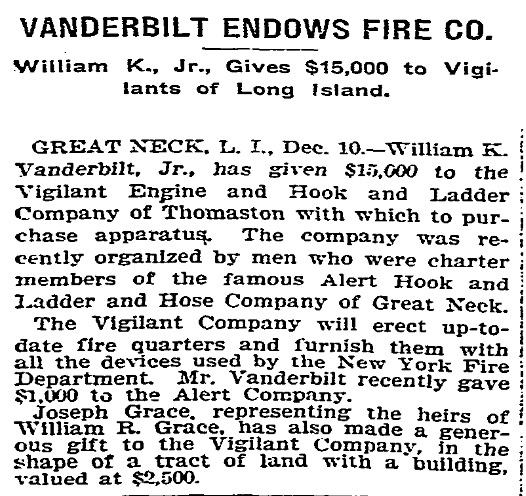 Art, The gentleman in uniform is William K. Vanderbilt Jr. in front of his country estate, Deepdale located at today’s Lake Success. In 1904 he sent word to the newly formed Vigilant Engine and Hook and Ladder Company of Thomaston that he was willing to pay for some of the necessary apparatus He paid for two engines which were delivered in early 1905. To show their appreciation of the gifts, Vanderbilt was made the first honorary member of the Company. He would prove be the Company’s biggest benefactor.
