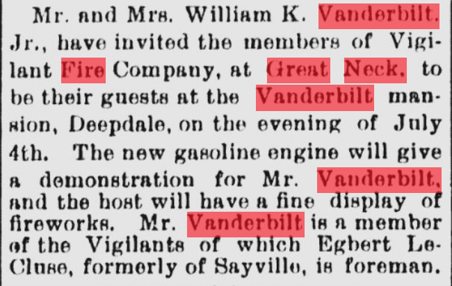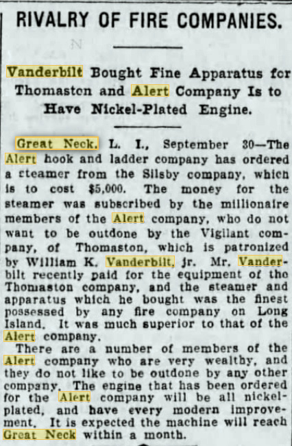 Vanderbilt took an interest in the new company and through his aid and guidance the Vigilants grew. He was delighted in seeing the fire company in action and at one time he staged a fire drill at his Lake Success mansion. Calling the men and equipment of the fire company to his home one afternoon, Vanderbilt watched eagerly as the members placed ladders and dragged hoses according to the accepted standards of firefighting in those days. Mrs. Vanderbilt also joined in the fun, running into the house midway through the mock firefighting proceedings to scream for help. Reacting immediately, the firemen scaled the ladders in the best heroic fashion and hauled Mrs. Vanderbilt and an accomplice down from the “blazing inferno”.