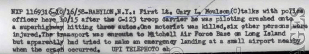 October 15, 1958 on the Southern State Parkway near Wellwood Avenue in Babylon.. The destination airport was Mitchel Field.