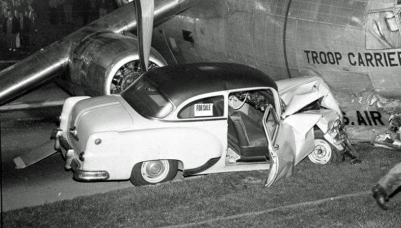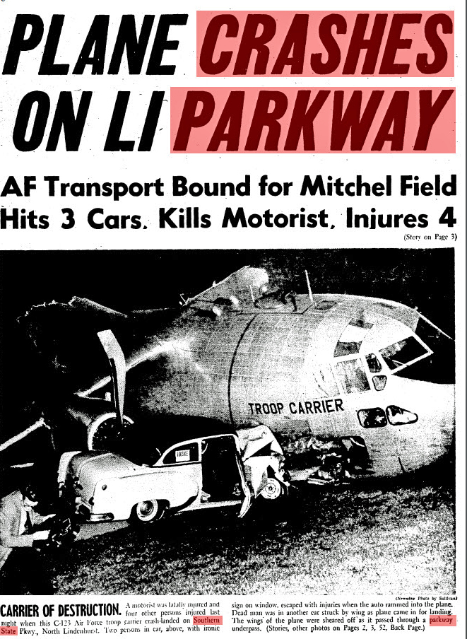 The info i found was that on October 15,1958 a C-123B-6-FA ran out of gas and crashed on the Southern State Parkway while attempting to land at Zahn’s Airport in Amityville. There was a person killed and 5 injured. I believe the car involved is a Pontiac maybe a 1950-1951.