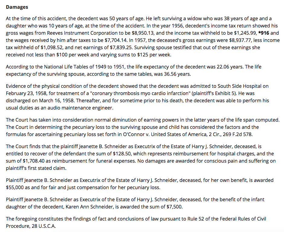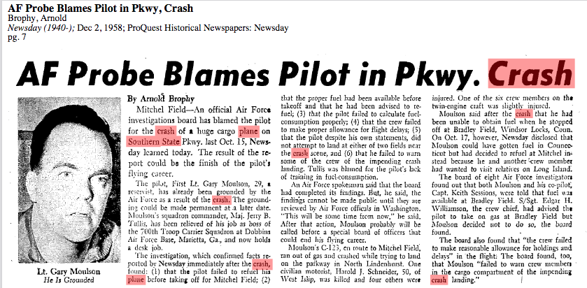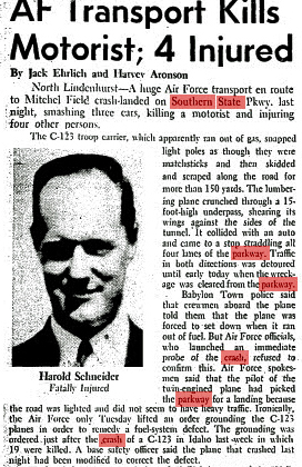 Harold J. Schneider of West Islip was driving on the parkway and was killed when the plan crashed. Damages of $55,000 were awarded to his wife and $7,500 to his daughter. Three Air Force personnel two other female motorists were injured.