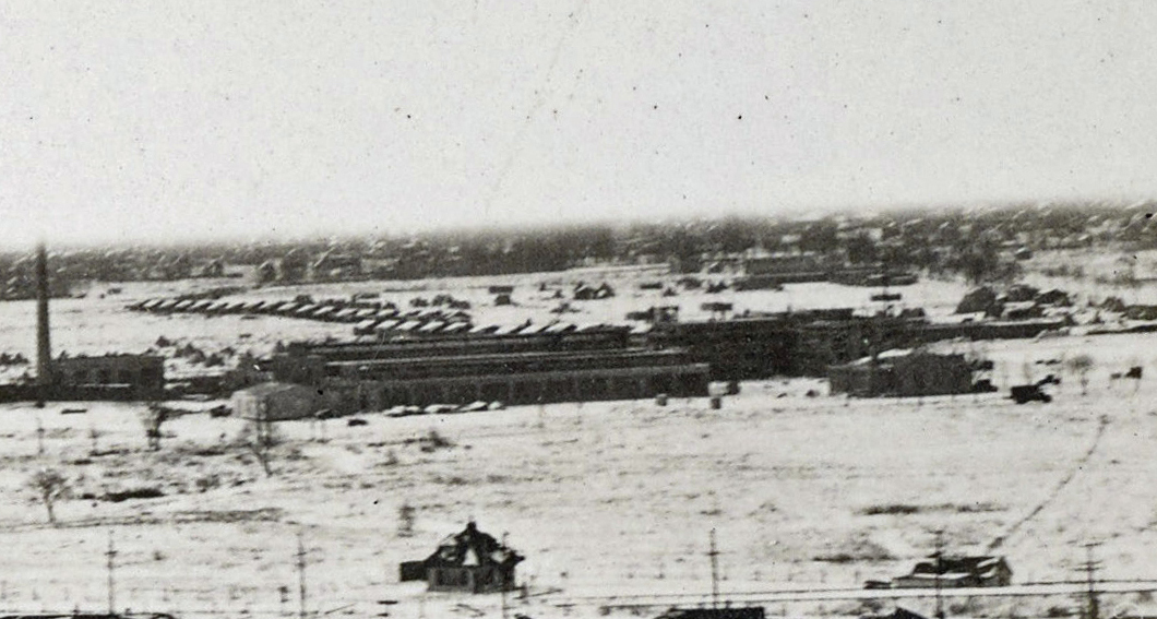 Building with the smokestack may have been the Camp Mills Power Building. Buildings off in the distance may have been associated with the Curtis plant in Garden City.