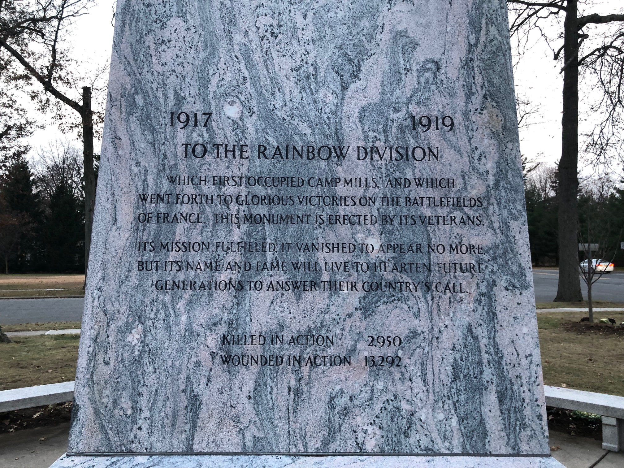 The Camp Mills monument on Clinton Road and Saint James Street in Garden City.