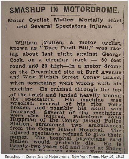 Between Coney Island, Brighton Beach and Manhattan Beach, there were numerous race tracks of various types. The Motordrome closest to Manhattan Beach was a perfectly circular board track featuring daredevil motorcycle riders on the extremely banked board track.
