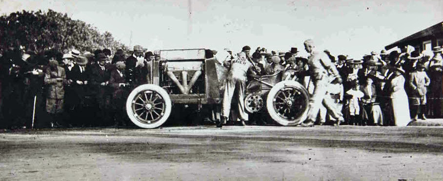 What seems certain is that the racer is a Fiat S74 with Barney Oldfield at the wheel. The location wouId be Santa Monica, but I found two dates, 1911 and 1914. 1912 seems to make more sense, because Oldfield started in that race on a Fiat S74 and I have a picture of him wearing a Select Kid Maier overall during the race, but the text on the car seems to be absent. So I’m not sure.