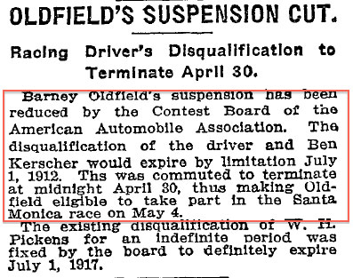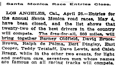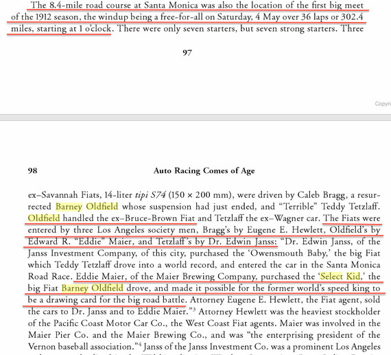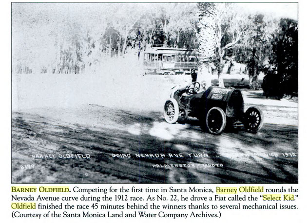 Barney Oldfield - the driver of the Maier Select Kid for the May 1912 race. Oldfield had been away from racing for one year due to his suspension by the AAA for his match race versus boxer Jack Johnson. This was Oldfield's initial appearance on the Santa Monica course.