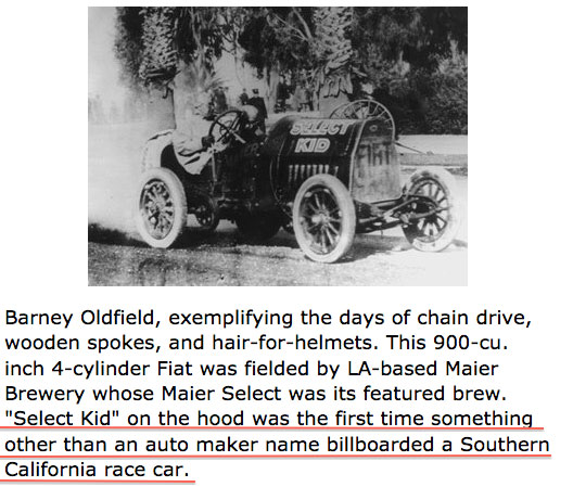 Mystery Foto #50…The car in the photo is a 1912 FIAT. This car was historically significant because painting the Maier Select Kid logo on the hood marked the first time something other than an auto maker was billboarded on a California race car.