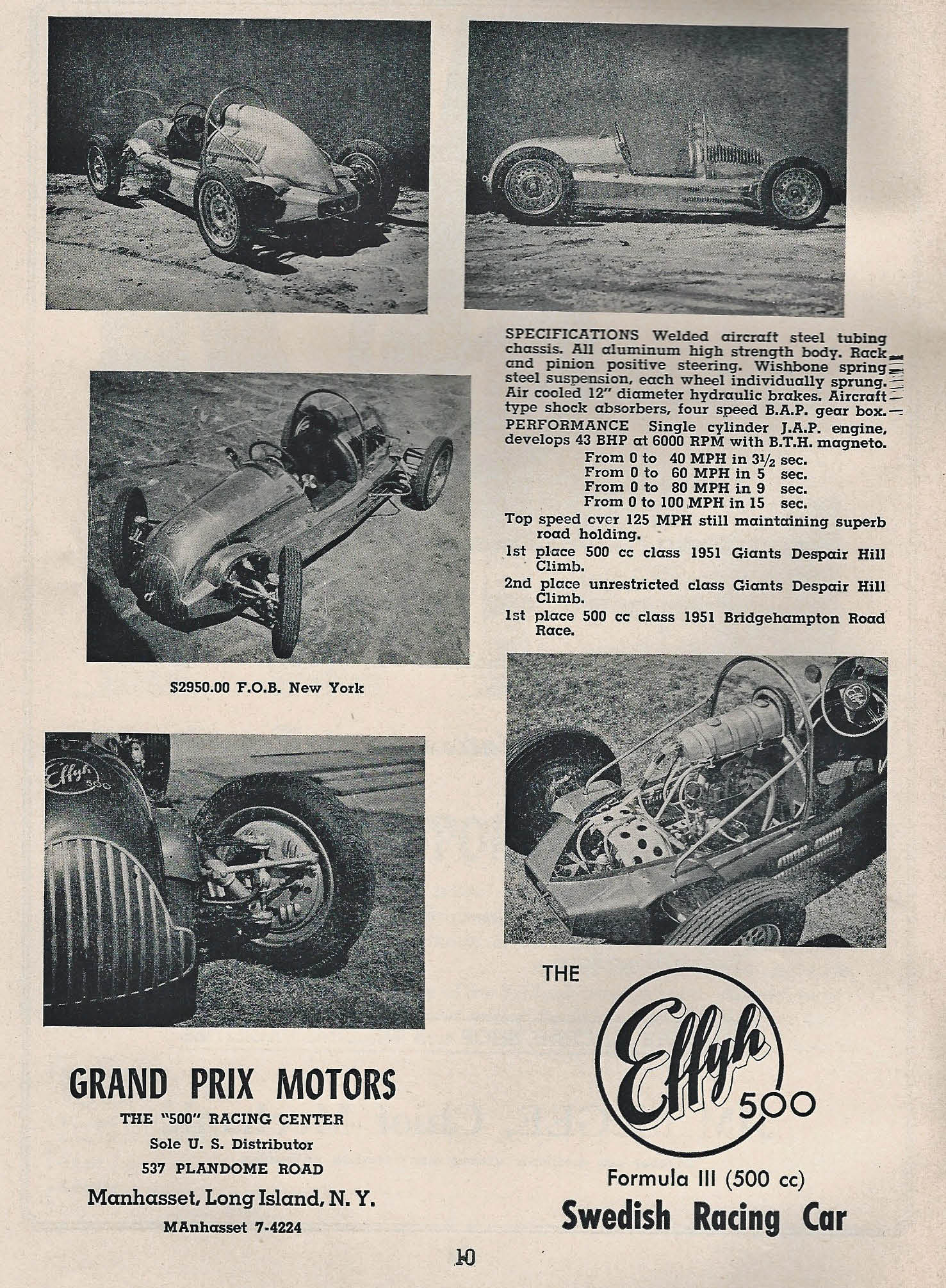 An ad for the Effyh 500 placed by Check Kotchan's Grand Prix Motors in the 1952 Bridgehampton Sports Cars Races program guide.