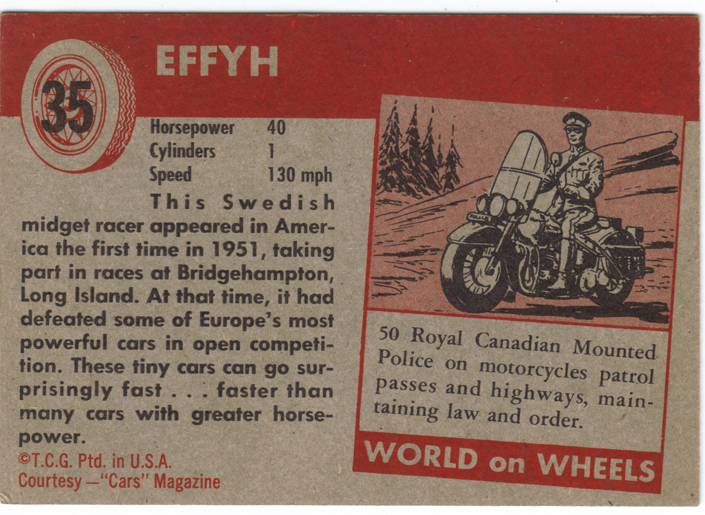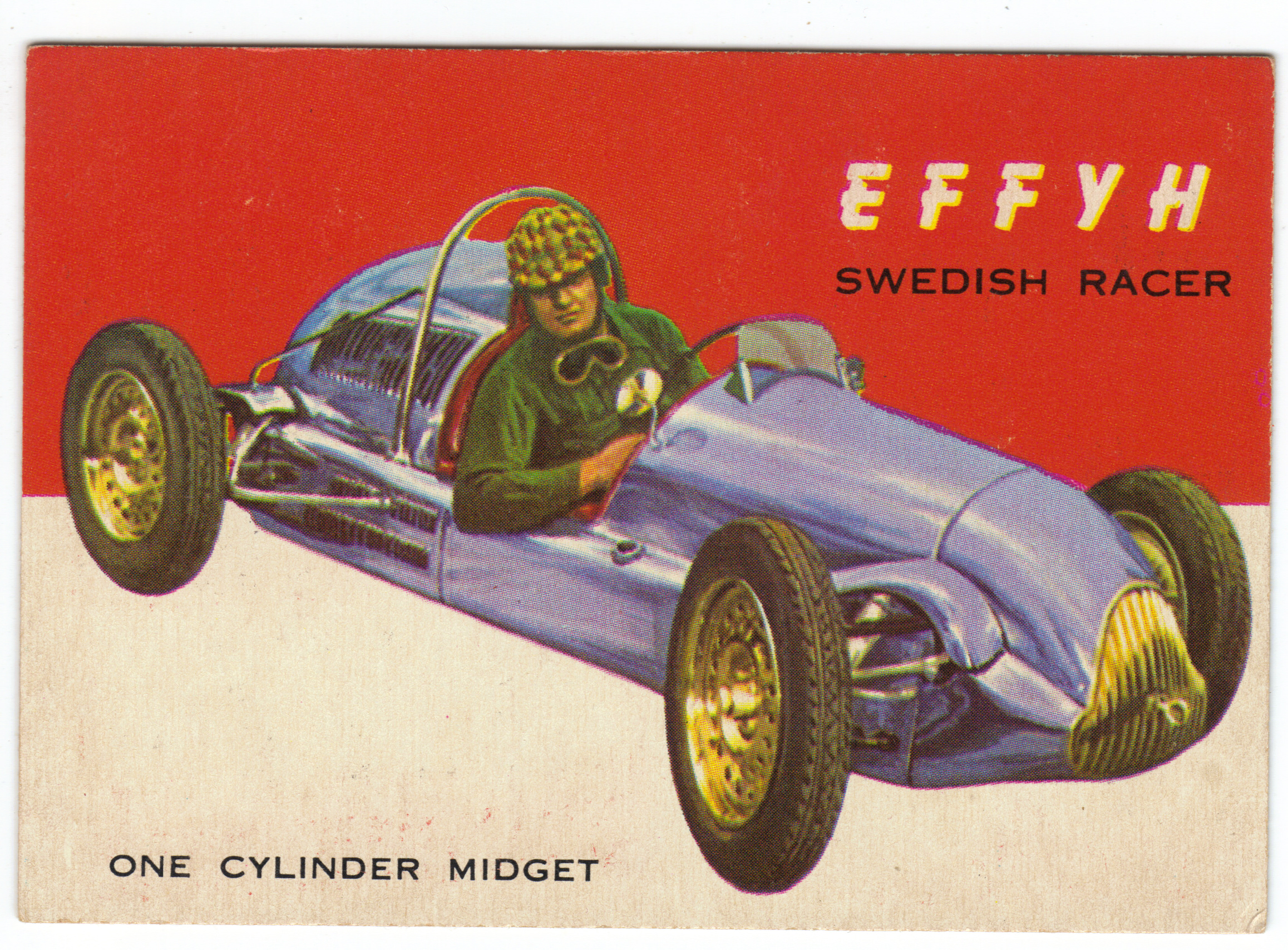 I’m also attaching three scans regarding the EFFYH, just for added interest. The first two (in color) is from a set of bubble gum cards I own issued by Topps Chewing Gum in 1953-1954. The third photo appears to be the original black & white used by Topps to produce its card. I found that on http://www.500race.com and appears to identify the driver as Walter Kotchan.