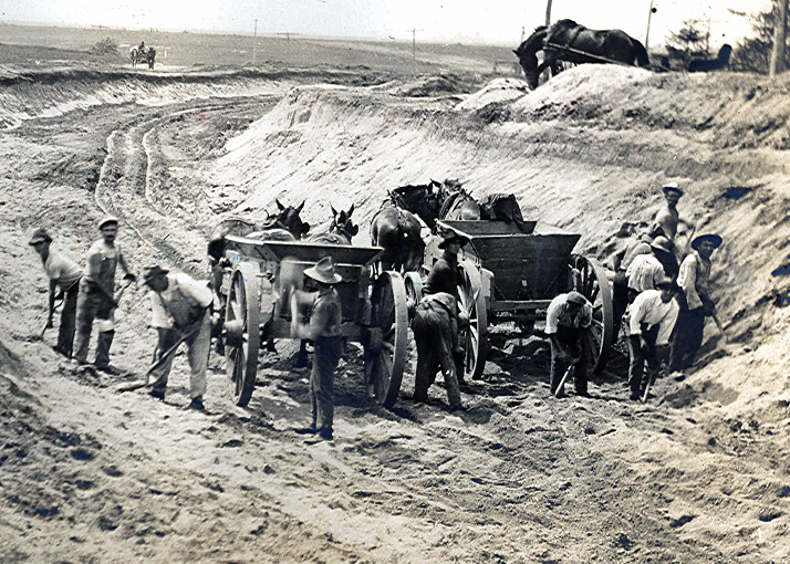 These laborers are digging deep and long during the summer heat of June 1908. Not even the horses could help with this task, except to carry the dirt away from the pit. Horrendous work conditions pre excavators. I only hope they were paid appropriately for their efforts
