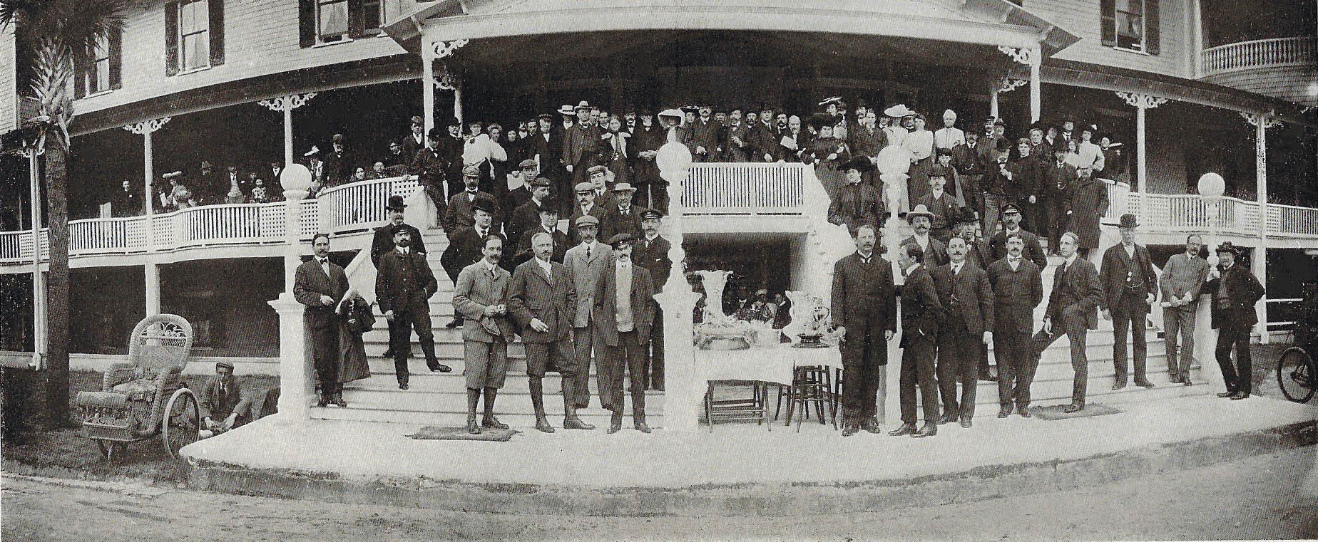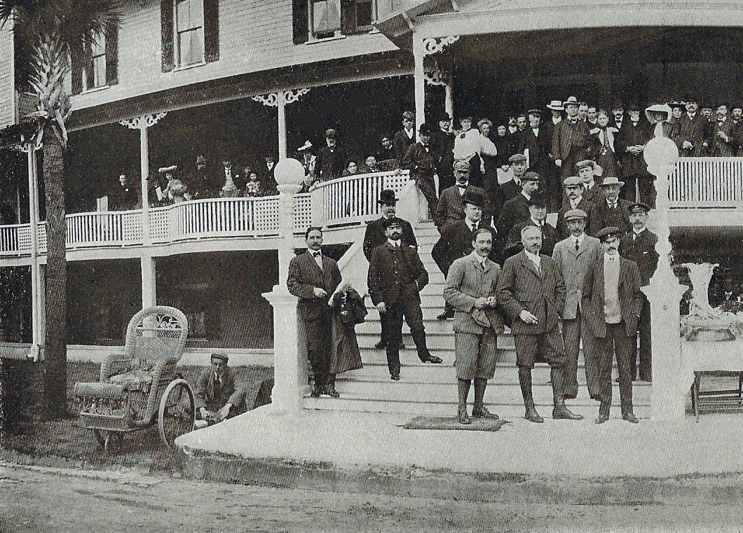 The visitors and officials in the photo were at the Ormond Hotel for the 1904 Ormond-Daytona Beach Automobile Tournament. For the event, William K. Vanderbilt, Jr. purchased a giant 90-hp Mercedes, among the most powerful cars in the world. On January 27, 1904, he set the one-mile land speed record on the beach going 92.3 mph, surpassing the record established earlier in the month by Henry Ford.