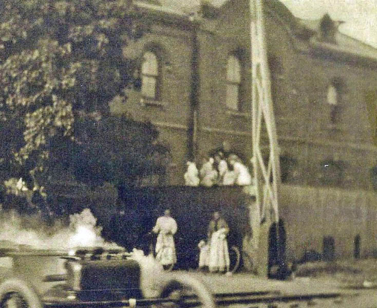 The Christie was on a road that crossed two sets of railroad tracks, which Main Street in Mineola did. The building in the background is still a mystery. Is it possible that it was one of the buildings of Nassau Hospital with nurses at the wall?
