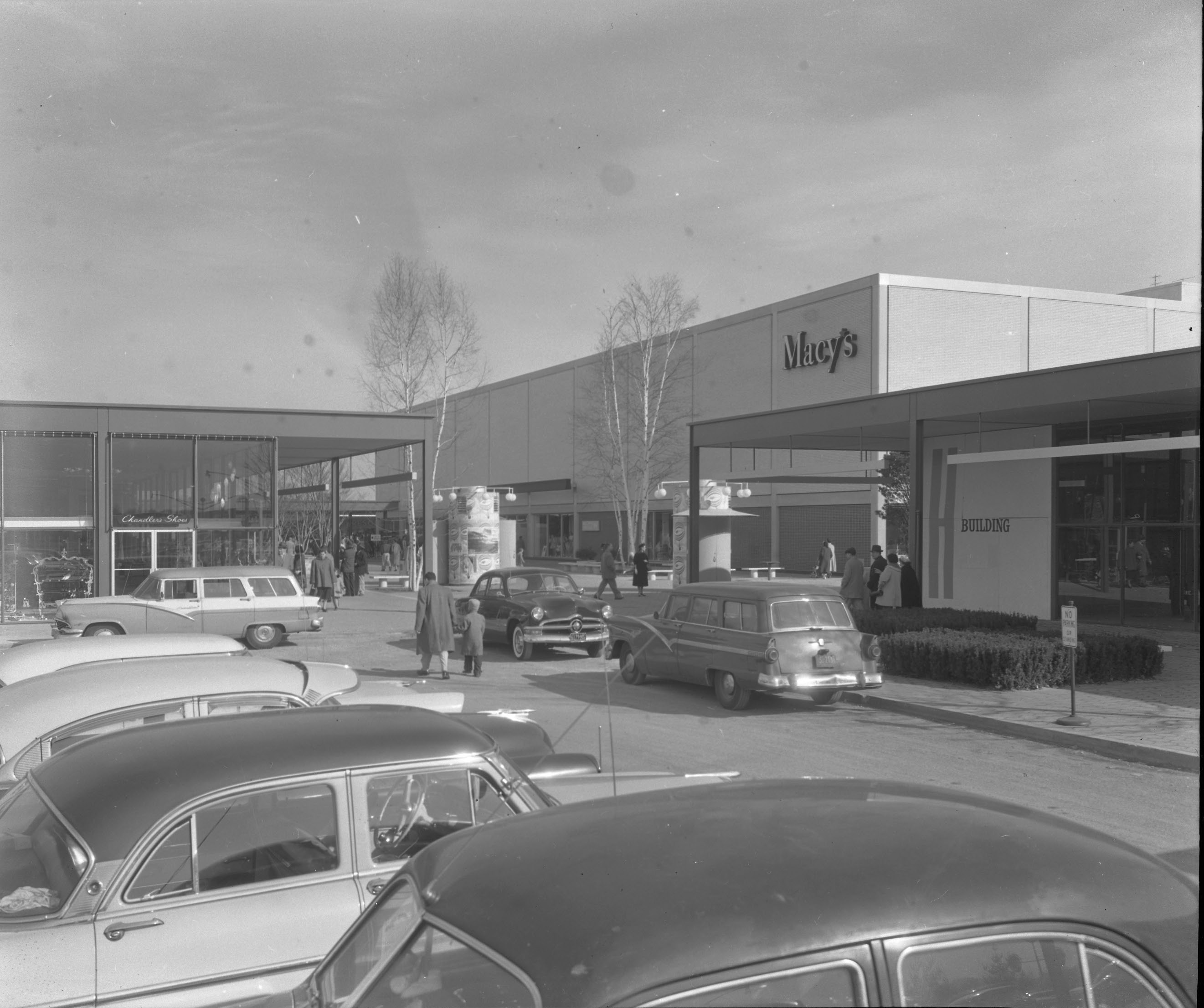Since I’m a Californian, I have no idea about the mall. I might be able to identify the cars, however. From the right (a) ‘55 Pontiac, (b) ‘49 Ford, (c) ‘55 Ford, (d) ‘54 Chevy, (e) ‘53 Olds (or maybe a Pontiac), (f) ‘56 Chrysler. . . . . . . . . Date of the photo is probably circa 1958-59.