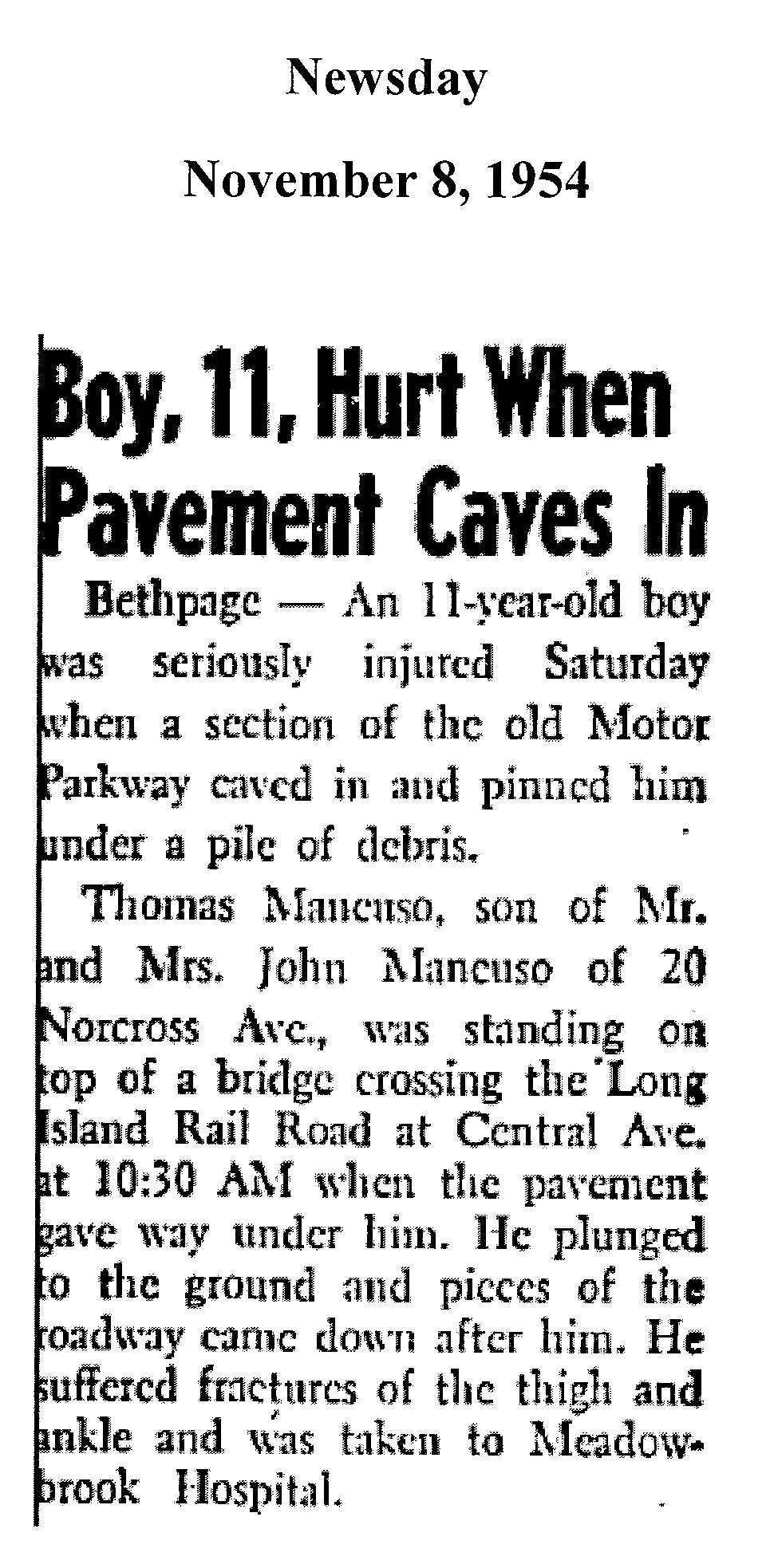I could be wrong, but to help clarify the 1954 incident of the boy on the Central Av bridge, the bridge had already been “removed” by 1950. That leaves the assumption that only the center of the bridge over the LIRR was removed, leaving the north and south abutments intact, perhaps to be removed at a later date. The boy, living on Norcross, had climbed the north embankment nearest his home, where it collapsed and fell below, but not over the center railroad tracks. Any thoughts on this is welcomed.