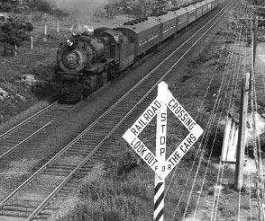 Central Avenue bridge, Bethpage looking East. Train is going west with the wooden diamond crossing sign on the south side, along with the outhouse.
