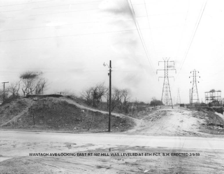 It looks like the right of way for the LIMP. Looking eastward at Wantagh Avenue, Levittown about 1959, the hill on the left shows the remains of the Parkway pavement. The parkway bridge went over Wantagh Avenue at this point. On the right side are the LILCO towers and transmission lines and substation in the background on the extreme right. The power lines and towers were erected on property owned by the Long Island Railroad, Central Branch.