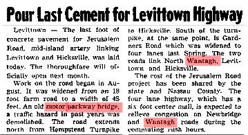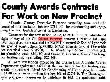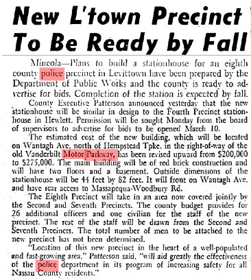 Art Kleiner: The 1949 article notes the demolition of the Motor Parkway Bridge over Jerusalem Avenue, a little west of Wantagh Avenue. I couldn't find an article about the Wantagh Avenue Bridge coming down but it probably was soon after. Definitely before the 1959 construction of the police precinct.