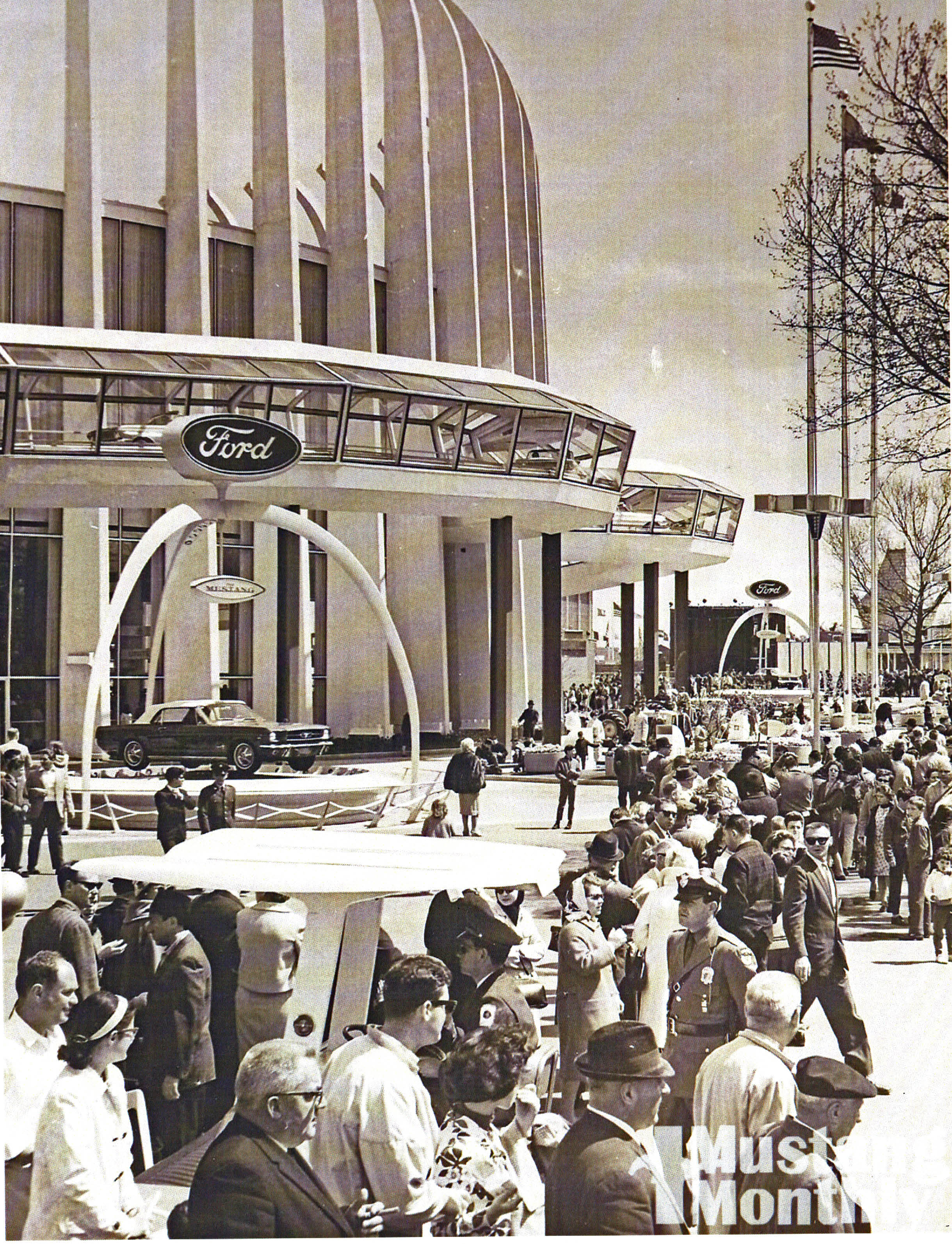 The photo was likely taken from April 12, 1964 to April 17, 2014. On April 12, 1964, Ford had a special showing of the Ford Pavilion for 2,600 guests. See below Kleiner's Korner. The official launch date of the Mustang was April 17, 1964.