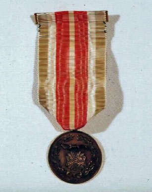 Medal presented to Charles Lindbergh by State Commander Green of the New York chapter of the Veterans of Foreign Wars, on June 16, 1927 at Roosevelt Field, NY. Col. Theodore Roosevelt spoke and introduced Lindbergh. This reception followed the Brooklyn reception and Knights of Columbus luncheon upon New York's Welcome Home celebration. 14K gold special medal of honor; obverse has VFW insignia with propeller above; reverse has inscription; red, white and blue striped ribbon attached to bar pin; accompanied by a scroll.; reverse has inscription 1981.67.27 Ribbon fragment with 2 red, 2 blue, and 3 white stripes, presented by the VFW, State of New York, Old Number 27.44.p3.25, Gathered by Louise O. Knight.