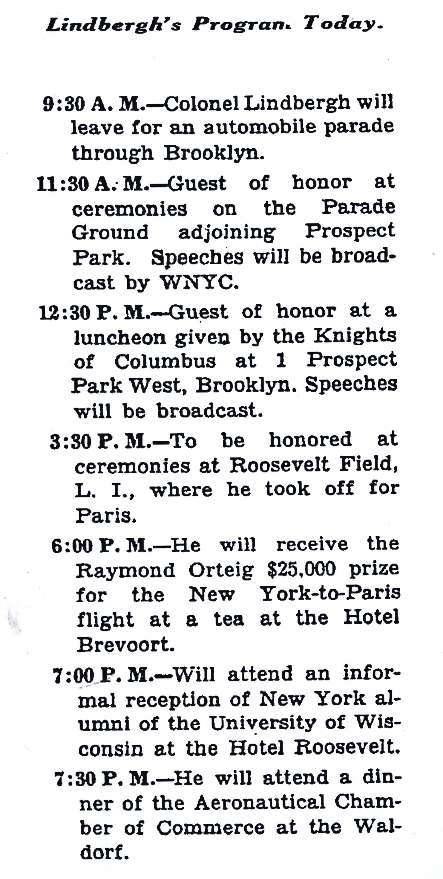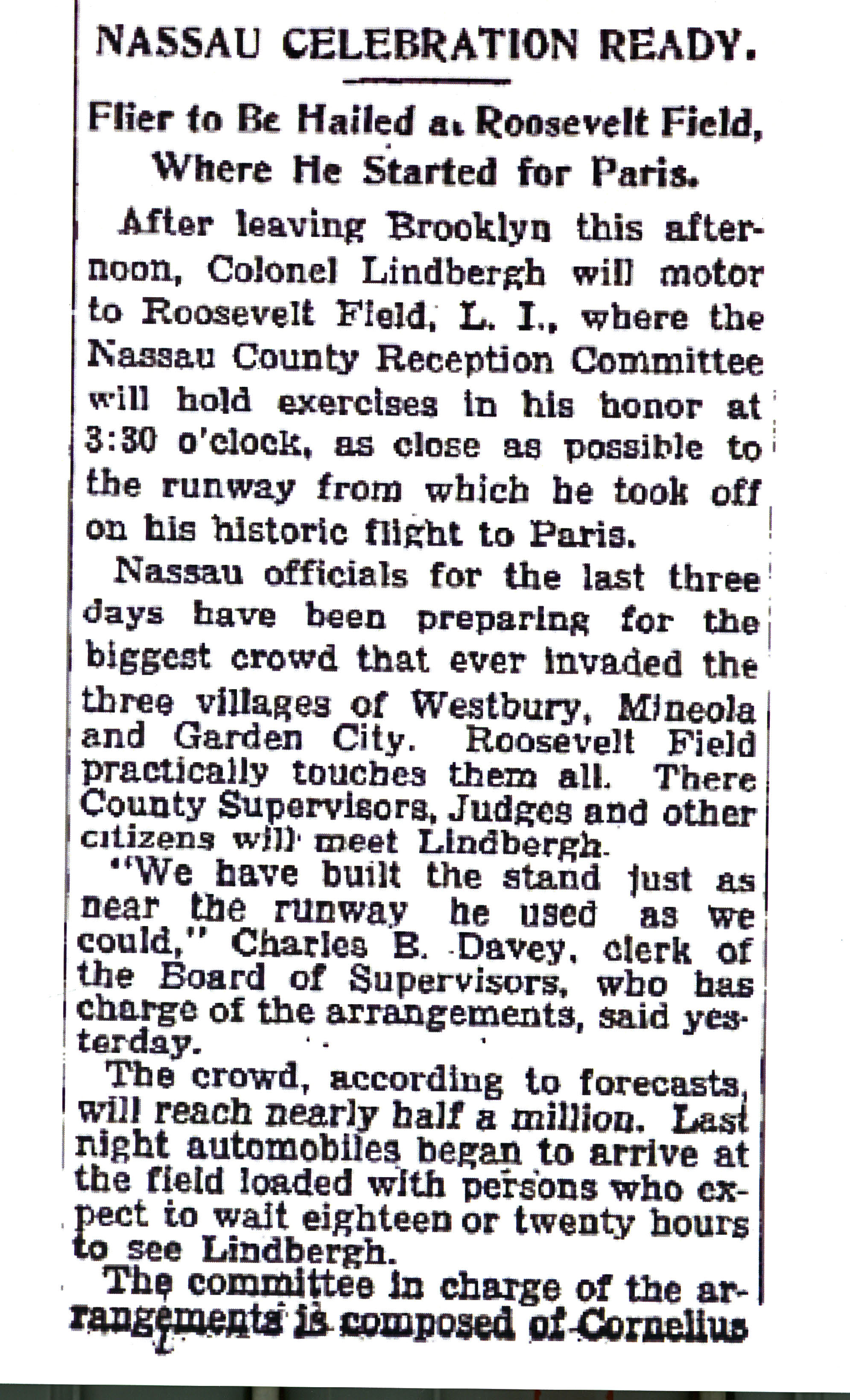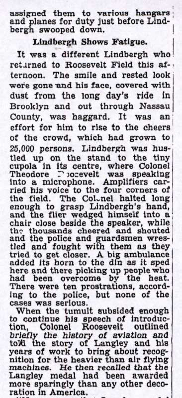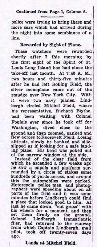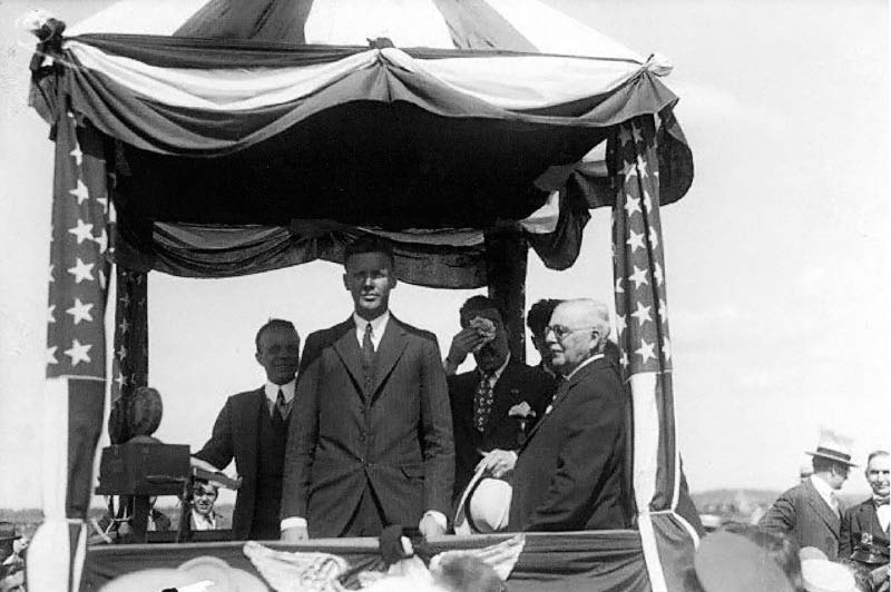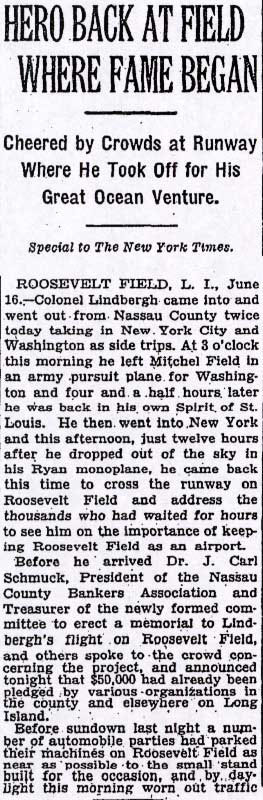 Charles Lindbergh returning to Roosevelt Field to celebrate his successful solo flight to Paris. Lindbergh had taken off from the Roosevelt Field east runway 27 days earlier.