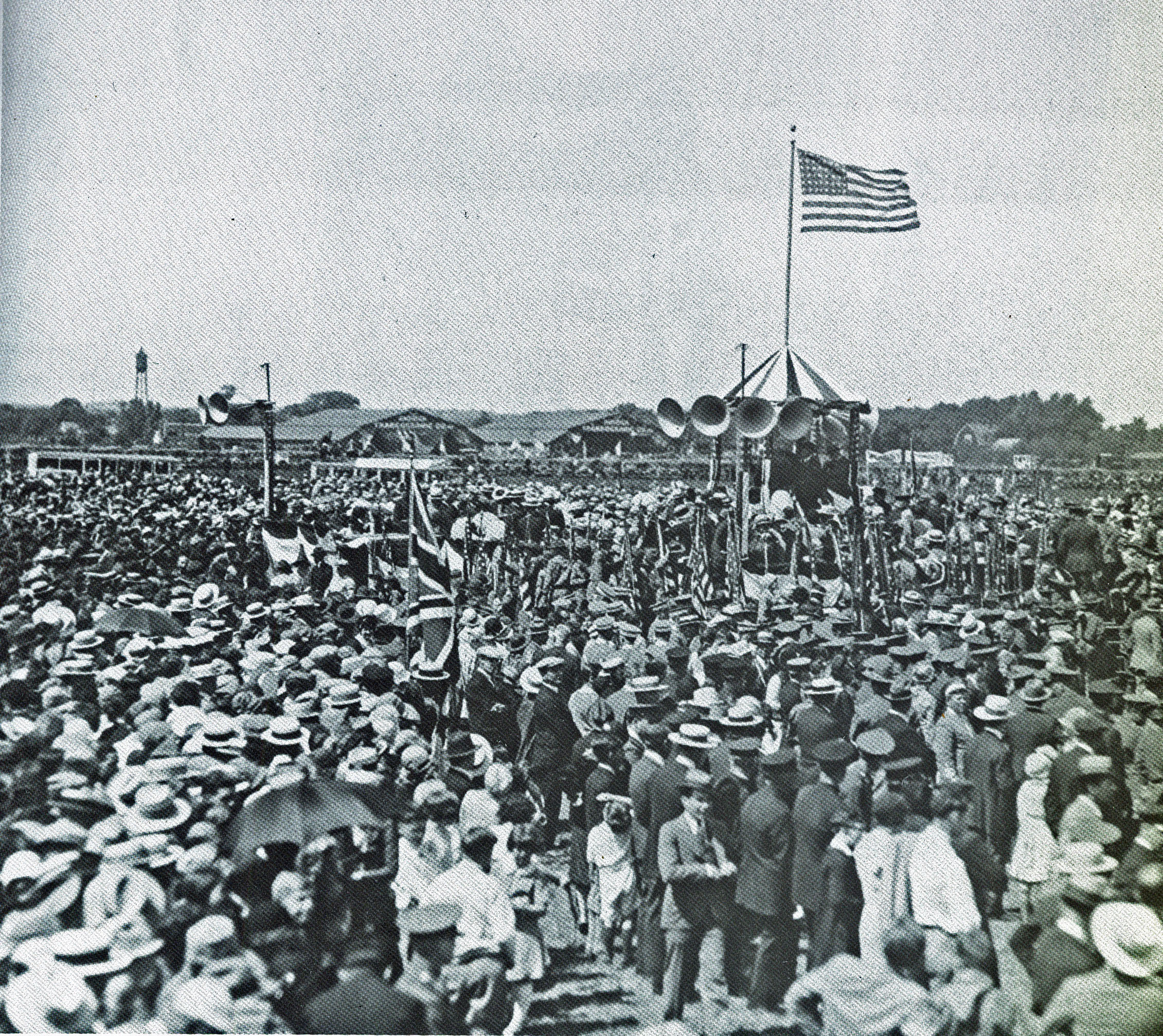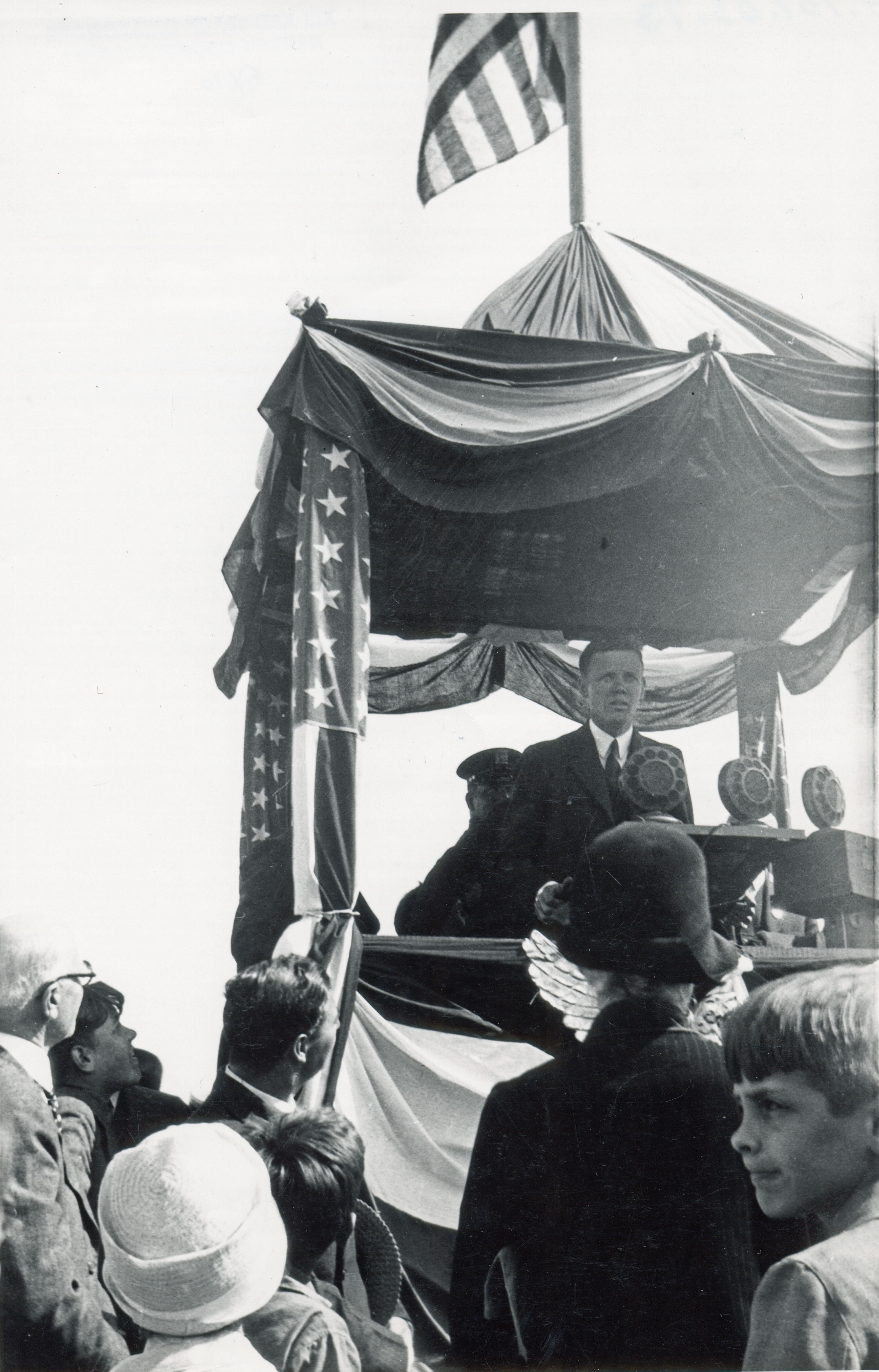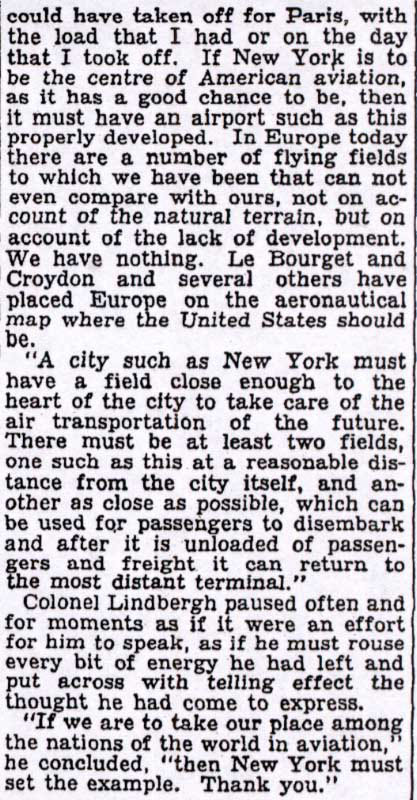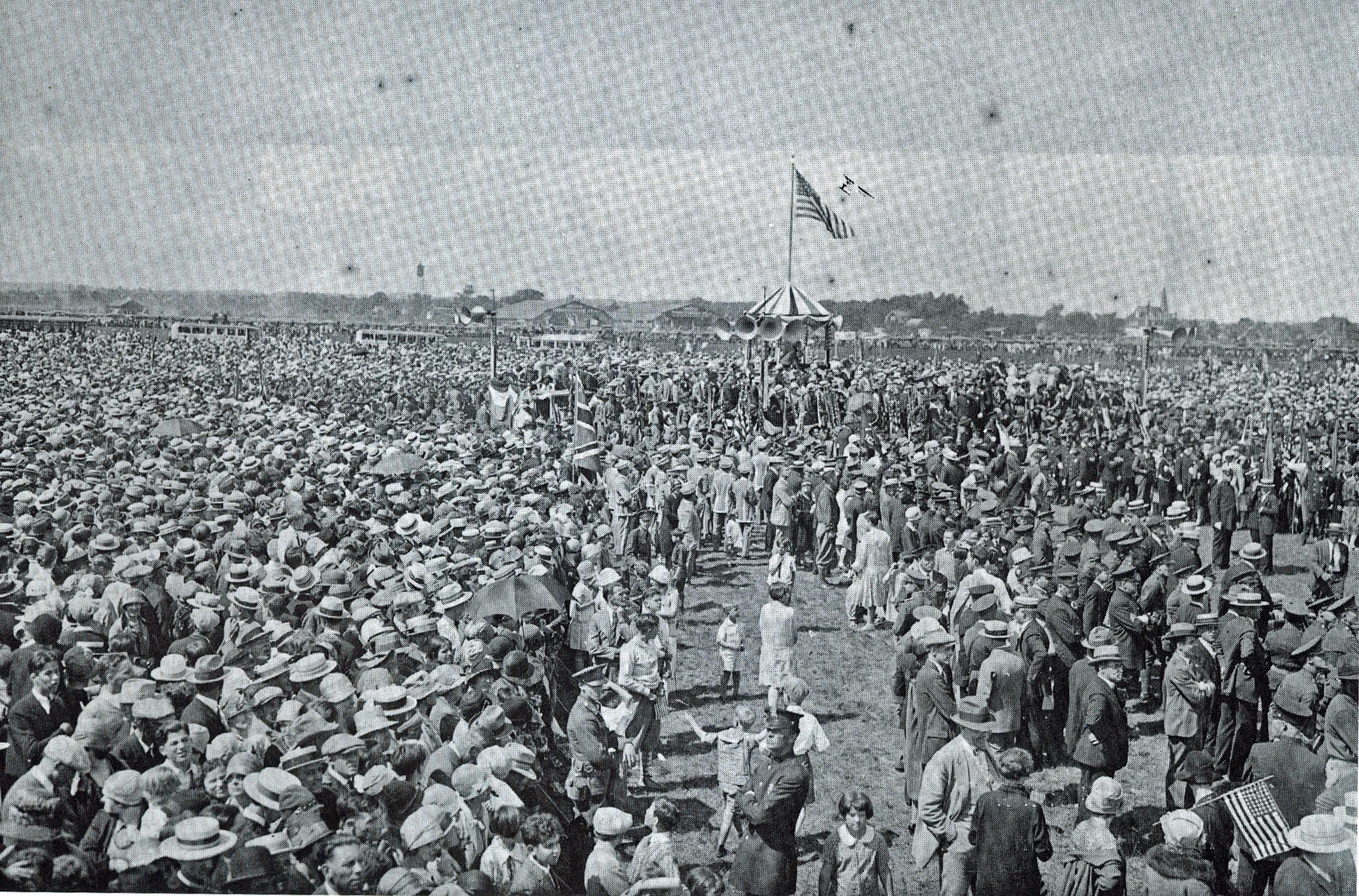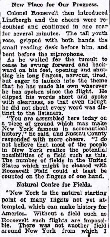 At the homecoming celebration in the center of the circle, Colonel Charles Lindbergh addressed the crowd and promoted the development of Roosevelt Field as a major aviation center. "If we are to take our place among the nations of the world in aviation, then New York must set the example."