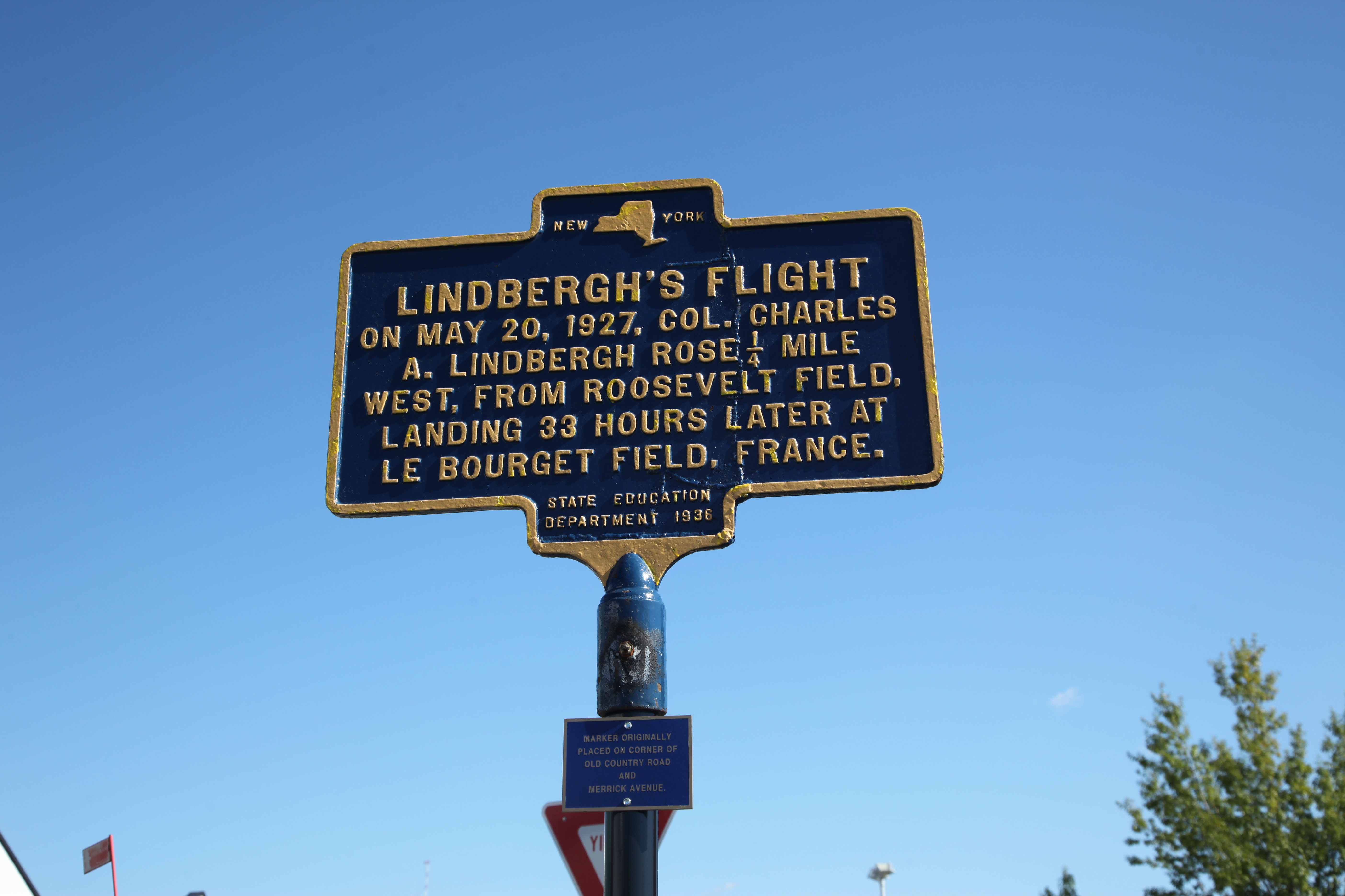 This historical marker Lindbergh's Flight was placed by New York State on the west side of Merrick Avenue where the Spirit of St. Louis just cleared the telephone wires The marker was placed approximately midway from the Merrick Avenue Motor Parkway Bridge and Old Country Road.