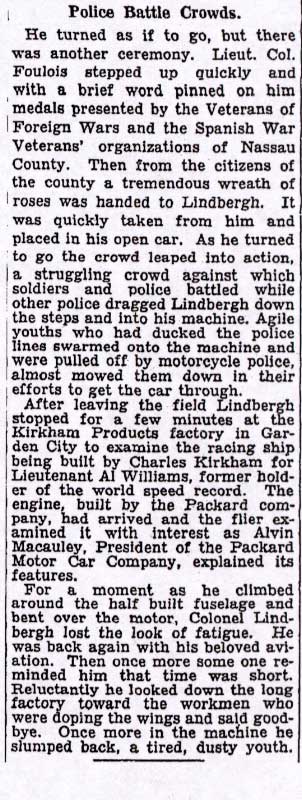 Return of Charles Lindbergh to Roosevelt Field 27 days after his solo flight to Paris.