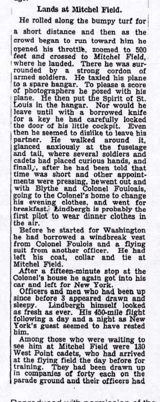 June 16, 1927. Lindbergh had flown from Bolling Field, Washington, DC to Roosevelt Field (2 hours and 35 minutes). He then flew from Roosevelt Field to nearby Mitchel Field (5 minutes).