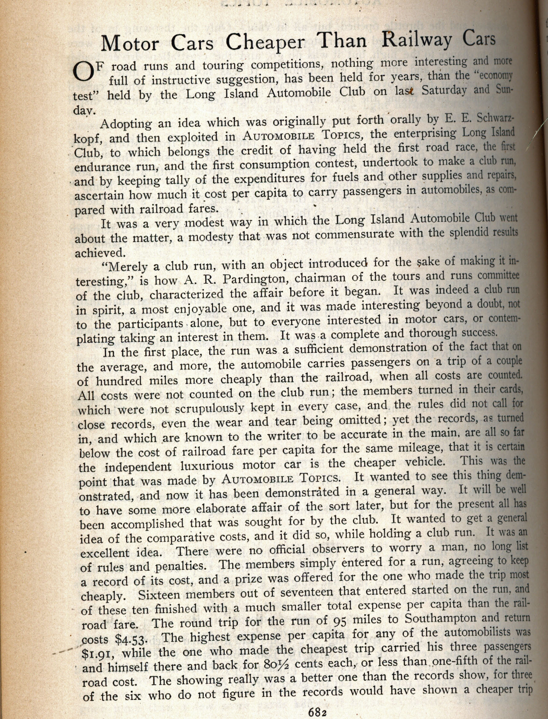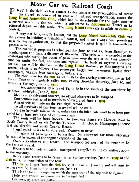 The event was the Long Island Automobile Club Economy Run from Brooklyn to Southampton and back held on June 10-11, 1905. Sixteen automobiles participated in this 180-mile test to compare the costs to "to carry passengers in automobiles as compared with railroad fares." A. R. Pardington was the club's chairman of tours and runs committee and also the donor of the winner's trophy.