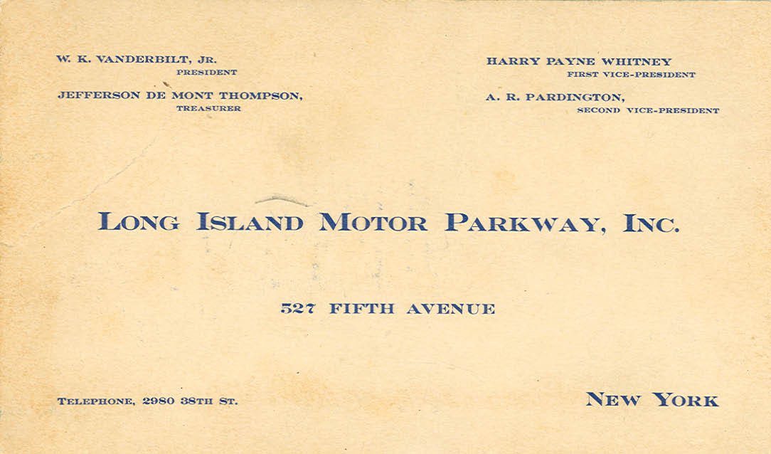 Mr. Pardington was organiser of the Long Island Automobile Club. Besides he was deeply involved in the organisation of the first Vanderbilt Cup race of 1904 and he was a referee during this race.  And also he was chief-engineer and vice-president of the Long Island Motor Parkway, Inc. and responsible for its construction. He hosted the Ground-Breaking Ceremony in 1908, the official start of the LIMP-construction.
