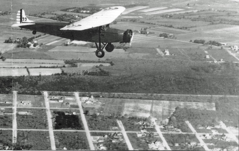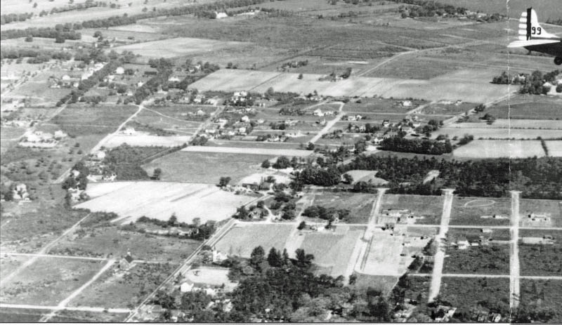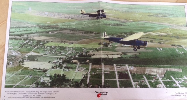 Aerial View of East Meadow Looking North along Newbridge Avenue. In View on the right is a Fokker Y1C-14 and on the Back Left is a Douglas C-29 East Meadow, NY circa 1935.