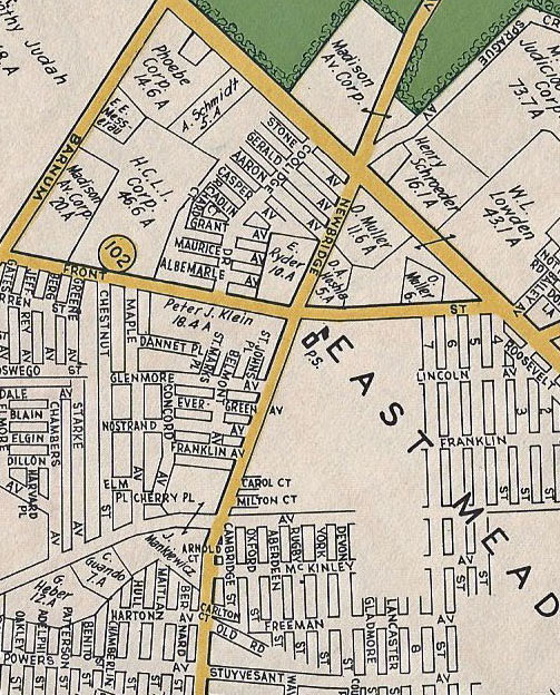 Interesting here is the newly laid out neighborhood in East Meadow at the very bottom of the photo. The longest horizontal road across the bottom is Freeman Ave, the shorter one just above that would be McKinley Ave. Starting at the first vertical road East of East Meadow Ave along McKinley is; Cambridge, Oxford, Aberdeen, Rugby, York, etc.
