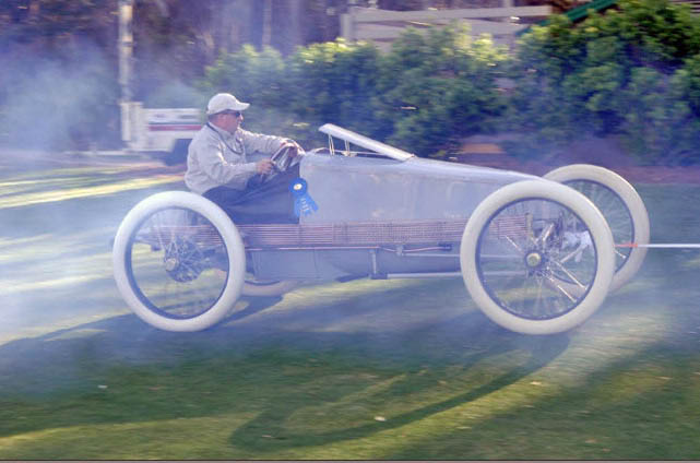 The instantly recognizable #16 Packard Gray Wolf driven by its designer Charles Schmidt, and his mechanician, William McIllrid.