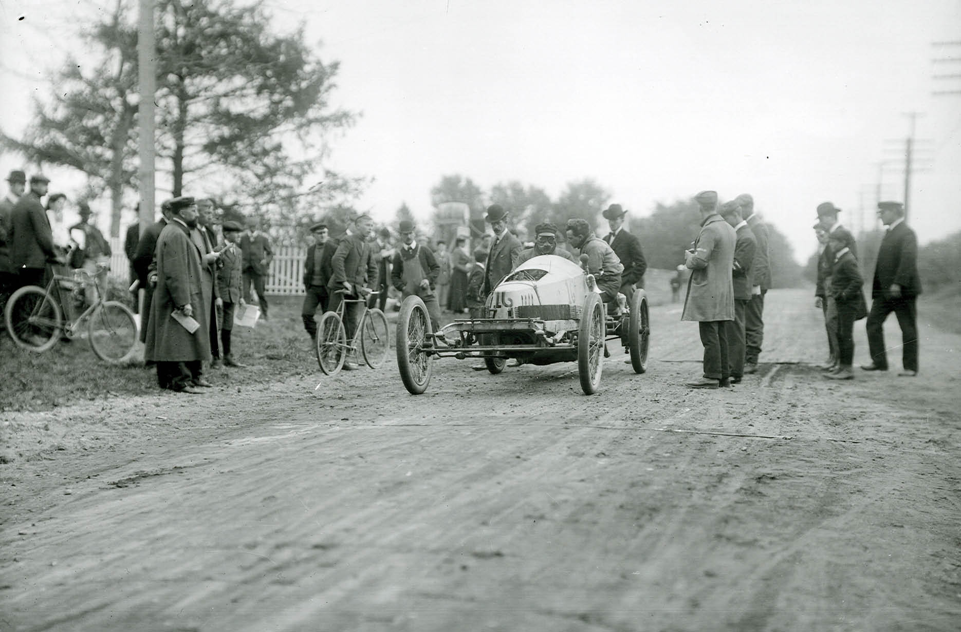 The photo shows Charles Schmidt on his Packard Gray Wolf with no.16 during the 1904 Vanderbilt Cup race. He is just passing the railroad crossing at Springfield Boulevard in Queens, which was located at the most western part of the 1904 circuit. The future circuits of the VC races on Long Island would never extend that far to the west. He finished on a respectable 4th place, and as the 2nd American car (behind Lytle on his Pope-Toledo).