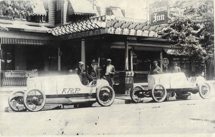 According to an online article in the Port Time Record, the cars are two Porter-Knight racers parked in front of the Ardencraig Inn, on Port Jefferson’s Main Street .