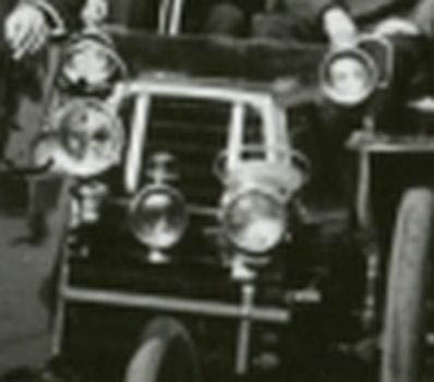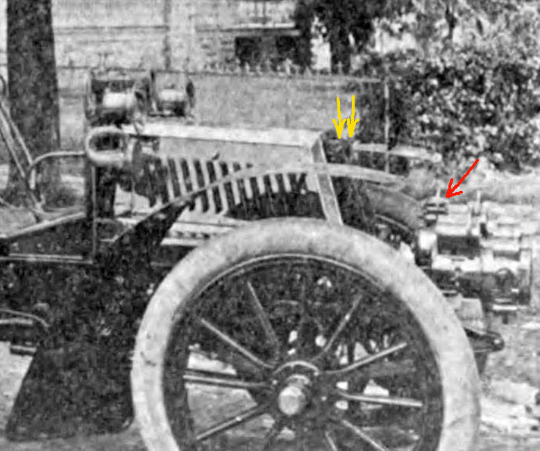 In the description can be read that the car had a very European appearance. In this case they mean of course Panhard- or Darracq-like because of the tubular cooling arrangement at the front, which was uncommon on American cars at the time. The two metal strips holding the cooling arrangement are vaguely visible on the side view of the photo (yellow arrows).If we look more closely however, a very distinguishing feature can be seen which is present on both photos: a third light in between the two normal head lights! In the side view photo the top of this centre light is just visible (red arrow). The cars on both photos could even have been the same car, because this front light arrangement was not a very regular feature at the time.