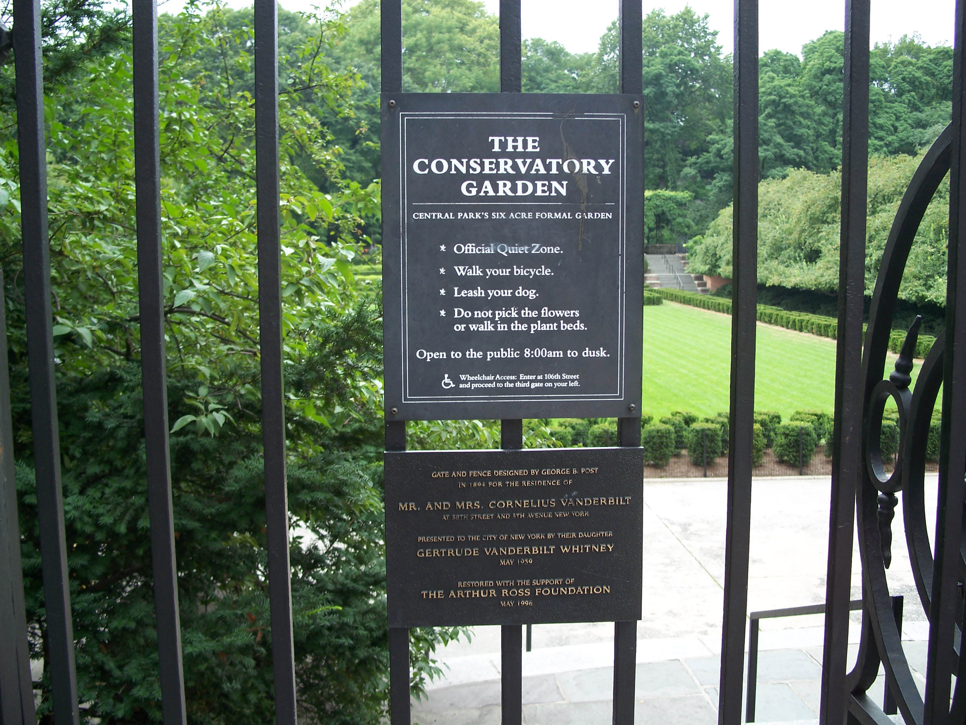 The gate and fence were gifted in May 1939 to New York City by Gertrude Vanderbilt Whitney, the daughter of Mr. and Mrs. Cornelius Vanderbilt. They still can be enjoyed at East 105th Street and Fifth Avenue. The "Vanderbilt Gate" serves as the entrance to Central Park's 6-acre Conservatory Garden.