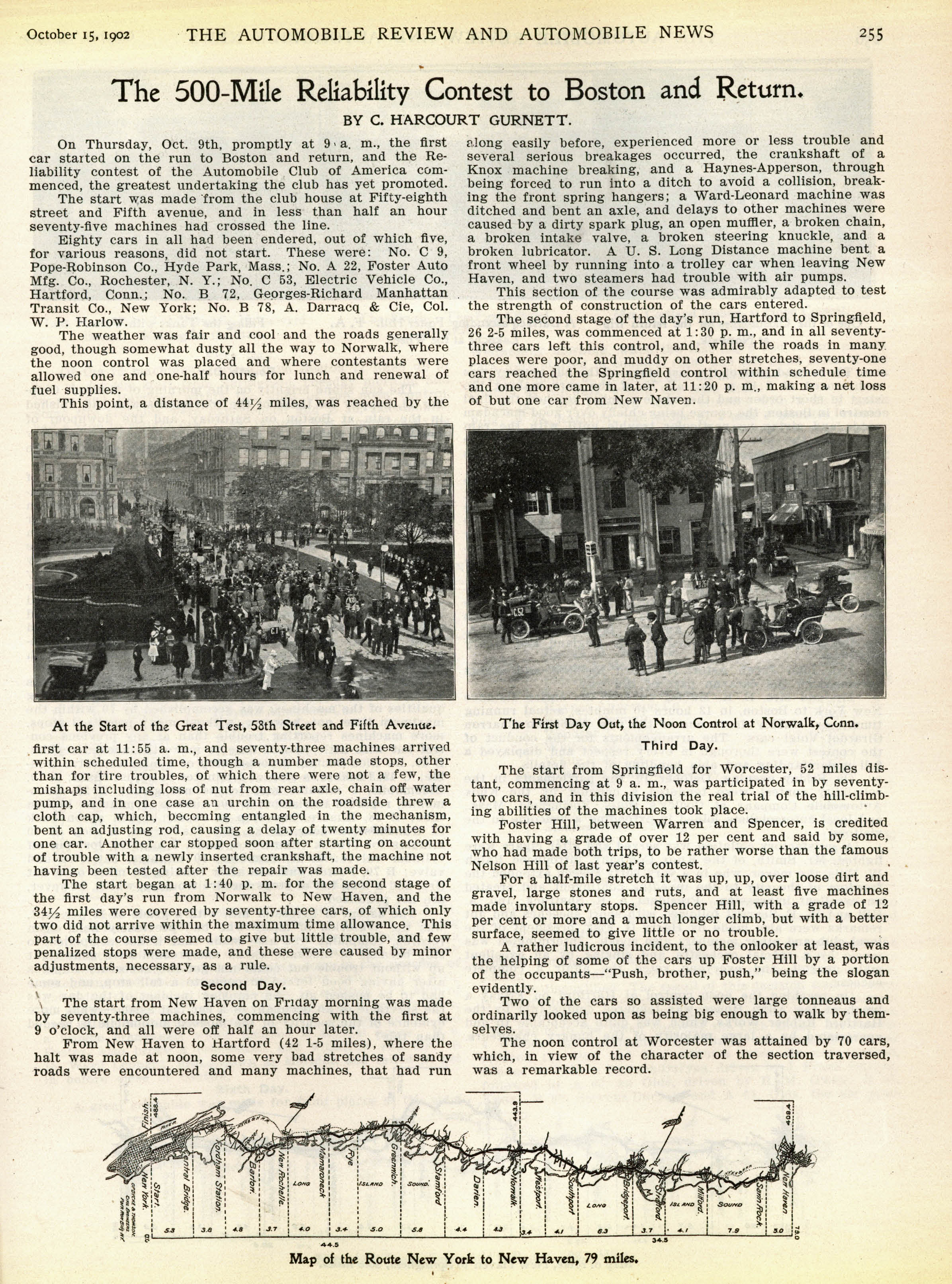 This 488-mile reliability run between New York City and Boston and back was sponsored by the Automobile Club of America. It was held over a seven day period from October 9, 1902 to October 15, 1902. The entire route was described in the October 4, 1902 issue of Automobile Topics.