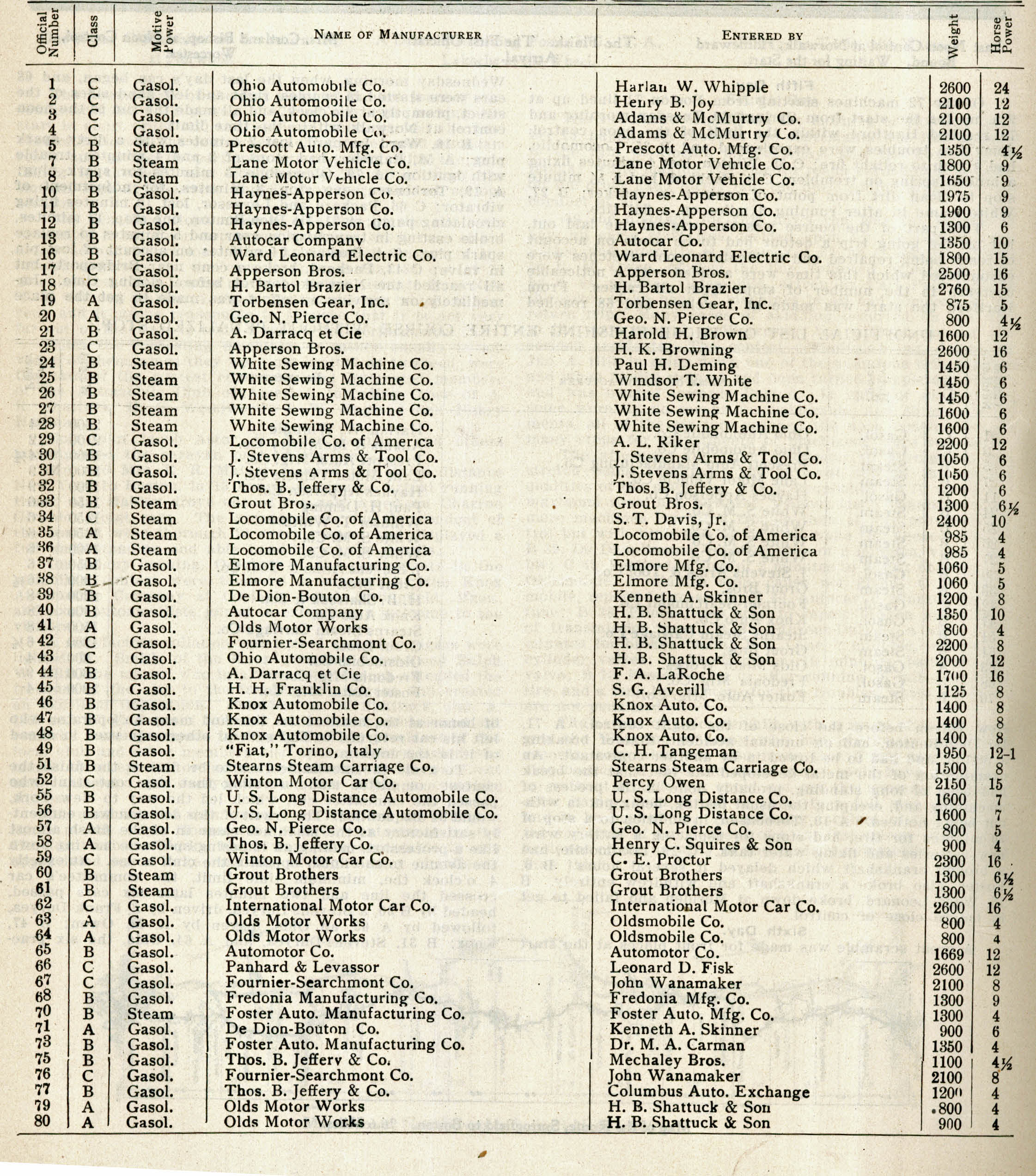 First lead is the order of the cars, the unknown car lined up directly behind the Grout steamers. The Horseless Age also presents a starting list with exact departure times. From this list it is clear that although the Packard with number1 started as the first car, the departure times of rest of the field was random. The Grouts with numbers 60 and 61 departed at 9.23 and 9.23.30 resp.. The next car leaving was number 23 at 9.23.45, which was the Apperson of H.K. Browning.
