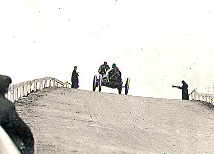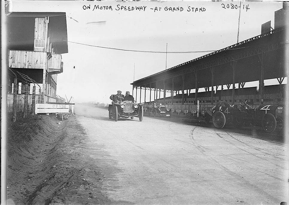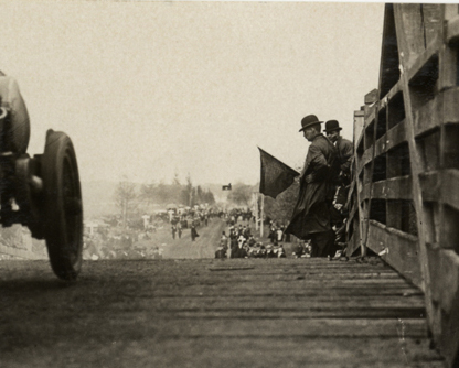 Note the grandstand on the left and the banner hanging over the road in the background. The banner likely provided a warning about the upcoming bridge.