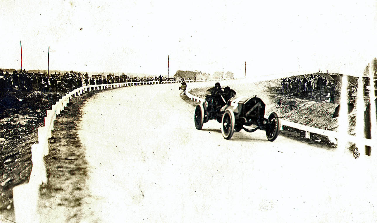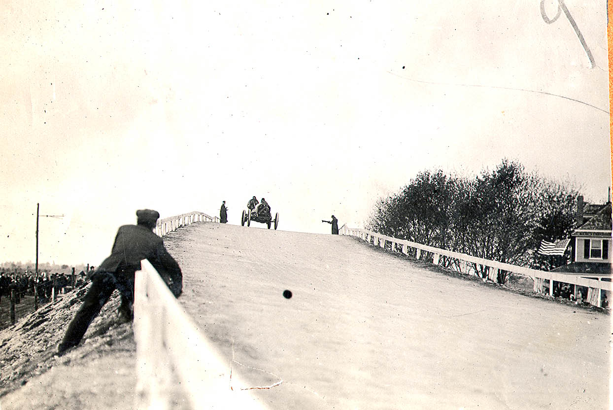 Chadwick/Lindquest, 1908 Vanderbilt Cup Race, heading south over the Ellison Avenue Railroad Bridge in Westbury.