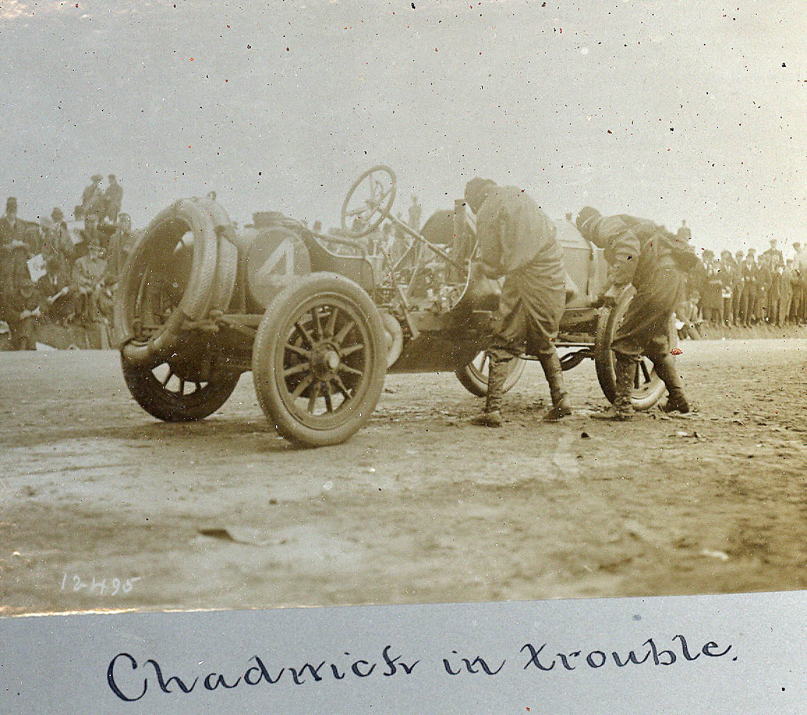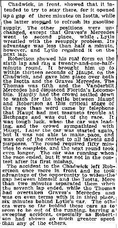 During Lap seven, the Chadwick developed a faulty magneto. and fell behind George Robertson's Locomobile by 35 minutes.