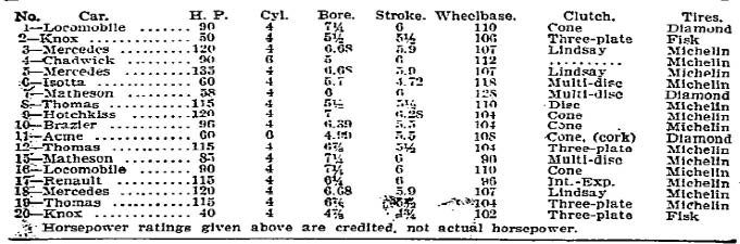Specifications of the 1908 entries