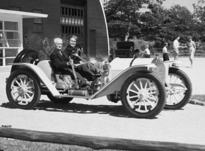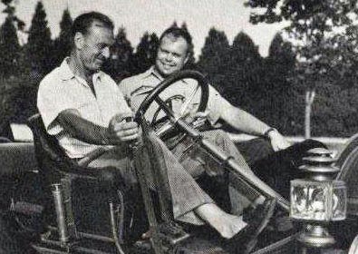 That looks like Gary Cooper in the driver’s seat with Henry Austin Clark, Jr. as his passenger. The car is a 1911 Mercer type 35-R Raceabout. Some references have the date as 1965 but since Gary Cooper died in 1961, the date of the photo is probably closer to 1960.