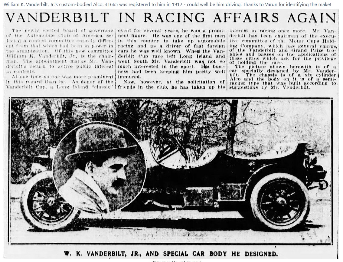 While the mystery photo does not picture Willie K Vanderbilt Jr. at the wheel, this allegedly was a custom bodied ALCO built for William K, Vanderbilt Jr. Although VanderbiltCupRaces.com does not have any record of Willie K. owning an ALCO as the newspaper articles assert (see below comments for newspaper clippings).