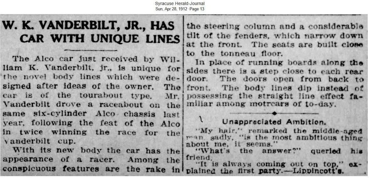 Connection: Modeled by Willie K. Vanderbilt, Jr. after Alco’s raced in the Vanderbilt Cup Races. Both attached articles are from 1912.