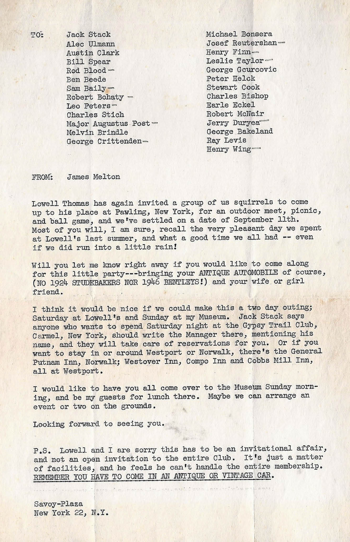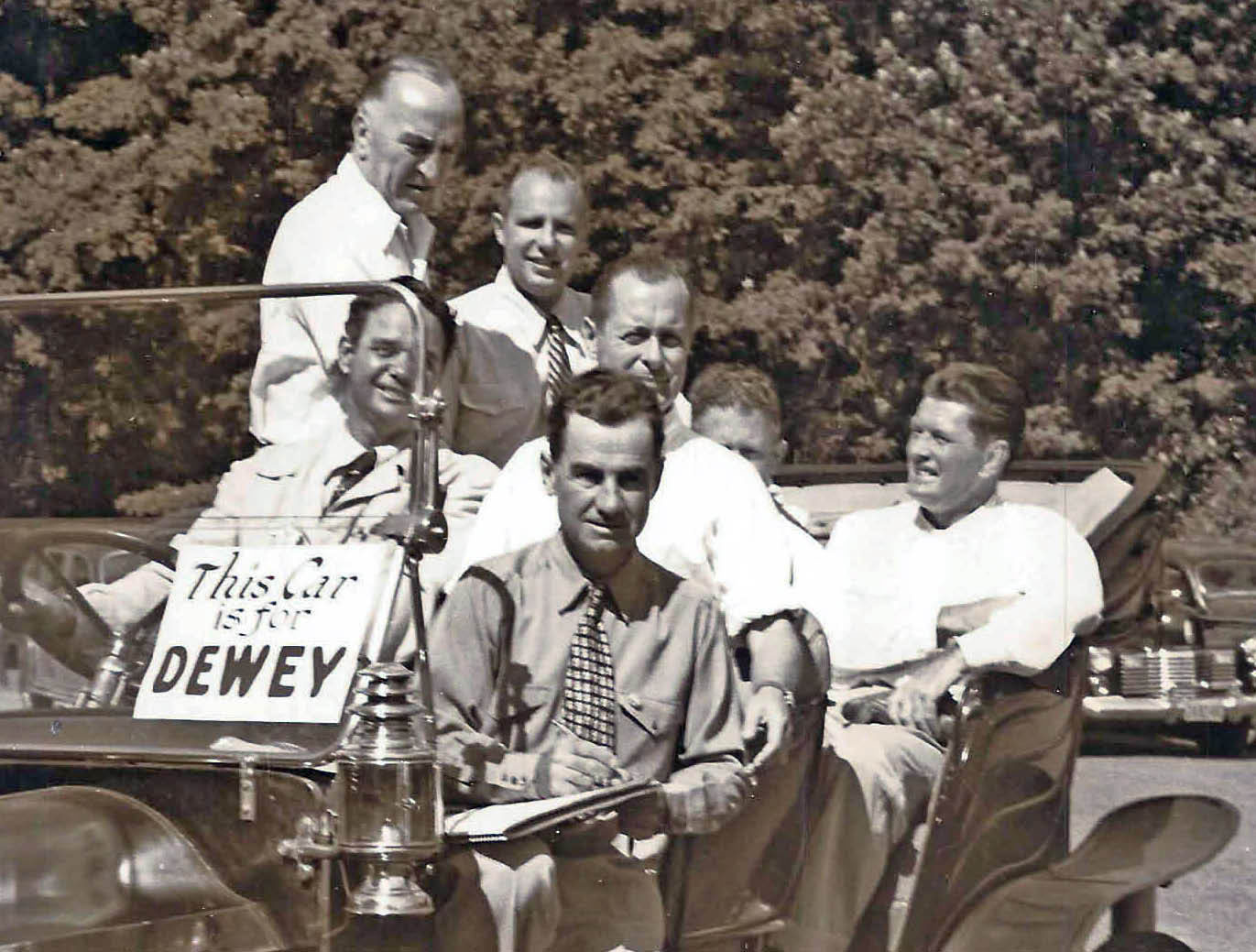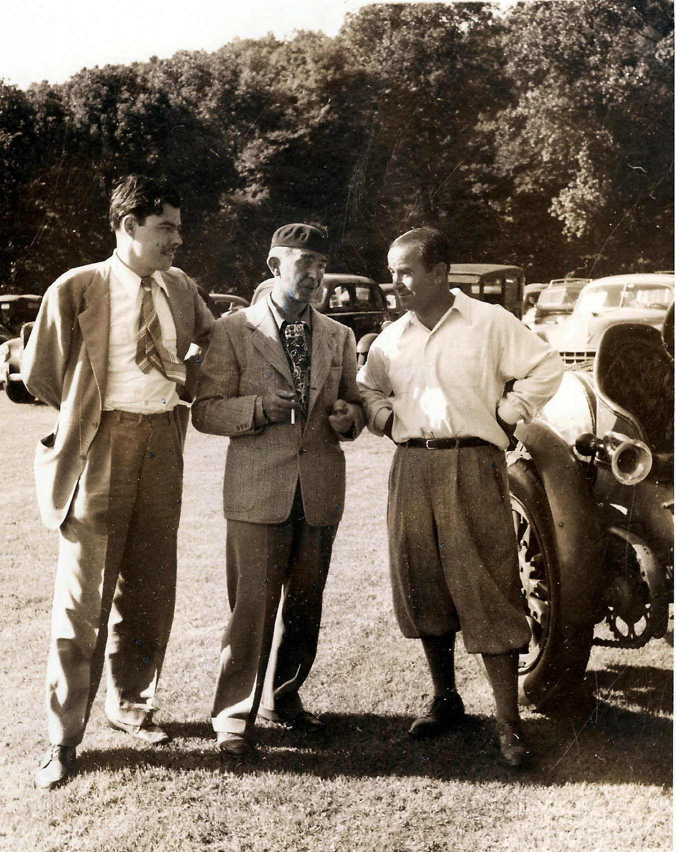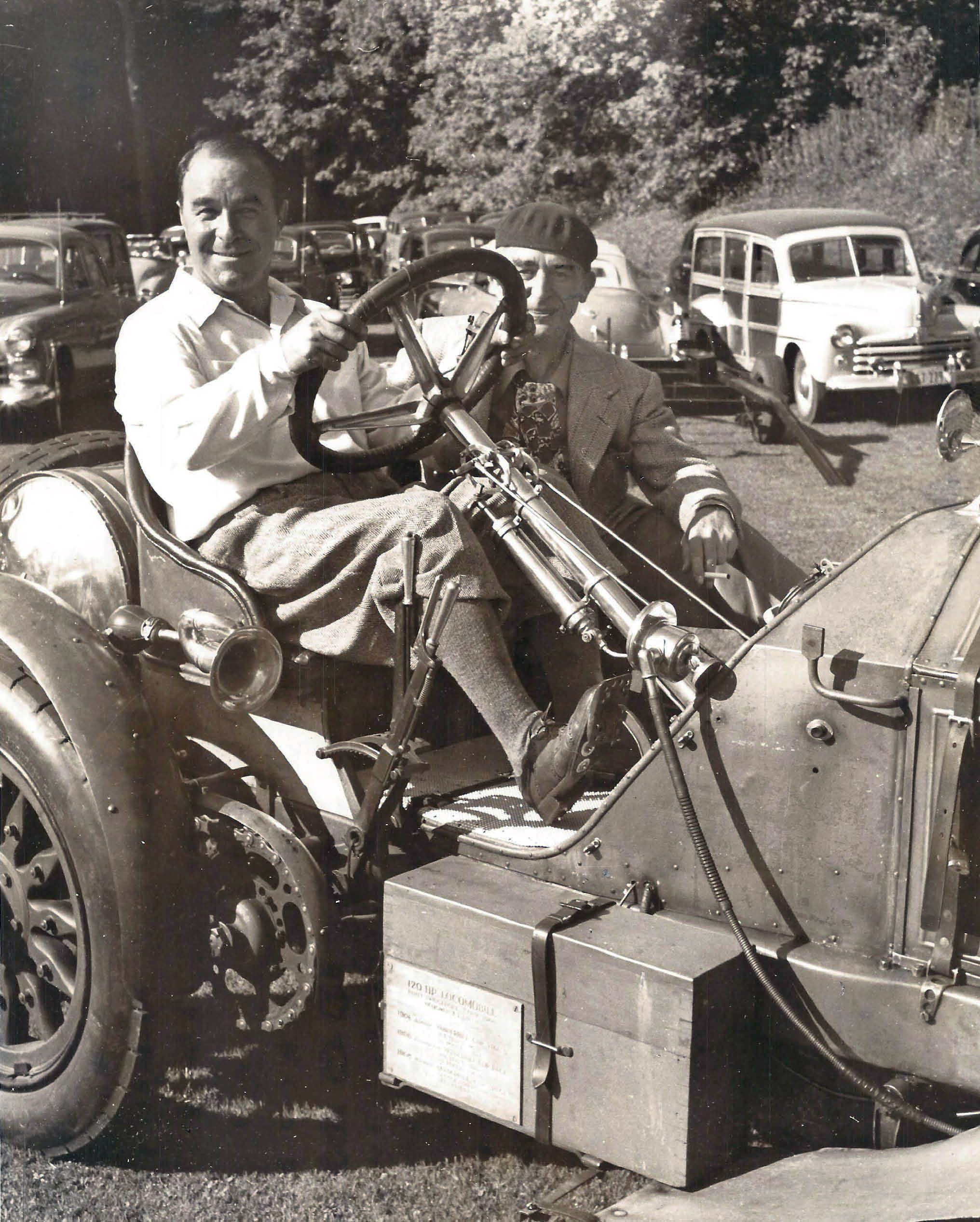I wasn’t going to comment, although I think that guest “A” is Eddie Rickenbacker, but it just occurred to me that it’s 40 miles from Boston Corners to Pawling! Can you even IMAGINE driving the BĂȘte Noir from Roslyn out to Yaphank just for a party? No trailering for Peter, not back then! I recognize a few others, like the boxer, but can’t name them. Mightn’t the writer, “B”, be a famous broadcaster, like Lowell Thomas? The “Dewey wins!” headline was on 03 Nov 1948 so it was probably a bit earlier. AHA; that’s tenor Jimmy Melton driving; he had a nice car museum up around Pittsfield or thereabouts (later moved to Florida)! Sam, III