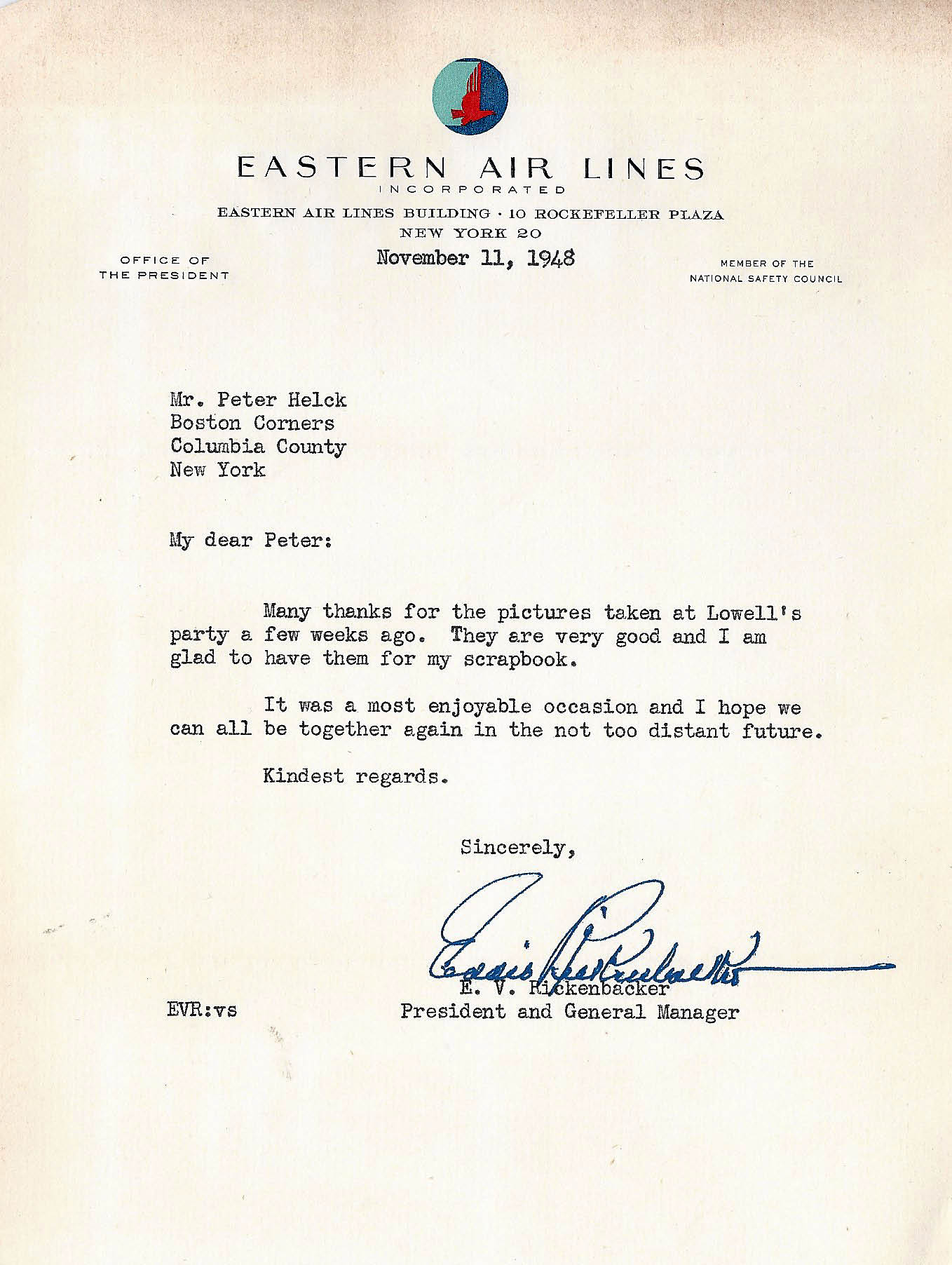 A letter to Peter Helck from Eddie Rickenbacker